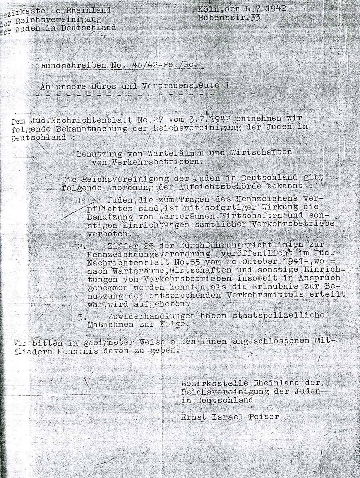 Die Bezirksstelle Rheinland der Reichsvereinigung der Juden teilt ihren Büros und Vertrauensleuten am 6. Juli 1942 Folgendes mit: