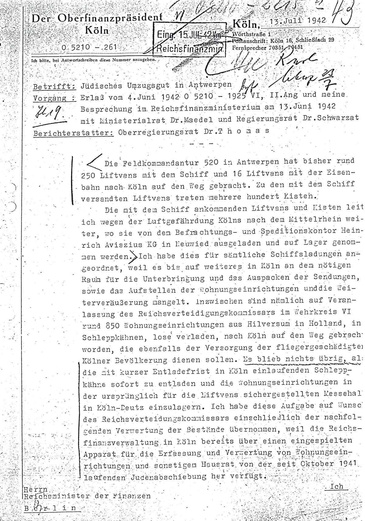 Am 13. Juli 1942 erstattet der Kölner Oberfinanzpräsident dem Reichsfinanzminsterium folgenden Bericht: