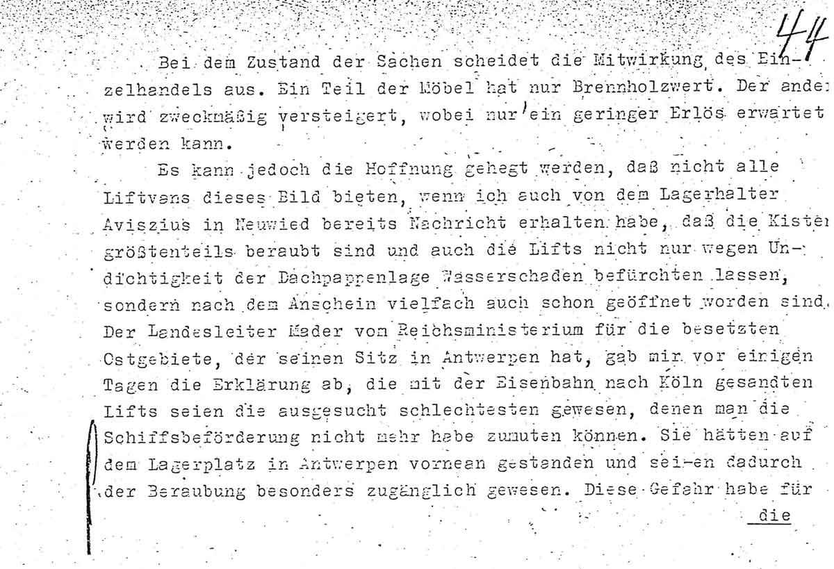 Es kann jedoch die Hoffnung gehegt werden, daß nicht alle Liftvans dieses Bild bieten, wenn ich auch von dem Lagerhalter Aviszius in Neuwied bereits Nachricht erhalten habe, daß die Kisten größtenteils beraubt sind und auch die Lifts nicht nur wegen Undichtigkeit der Dachpappenlage Wasserschaden befürchten lassen, sondern nach dem Anschein vielfach auch schon geöffnet worden sind. Der Landesleiter Mader vom Reichsministerium für die besetzten Ostgebiete, der seinen Sitz in Antwerpen hat, gab mir vor einigen Tagen die Erklärung ab, die mit der Eisenbahn nach Köln gesandten Lifts seien die ausgesucht schlechtesten gewesen, denen man die Schiffsbeförderung nicht mehr habe zumuten können. Sie hätten auf dem Lagerplatz in Antwerpen vornean gestanden und seien dadurch der Beraubung besonders zugänglich gewesen. Diese Gefahr habe für