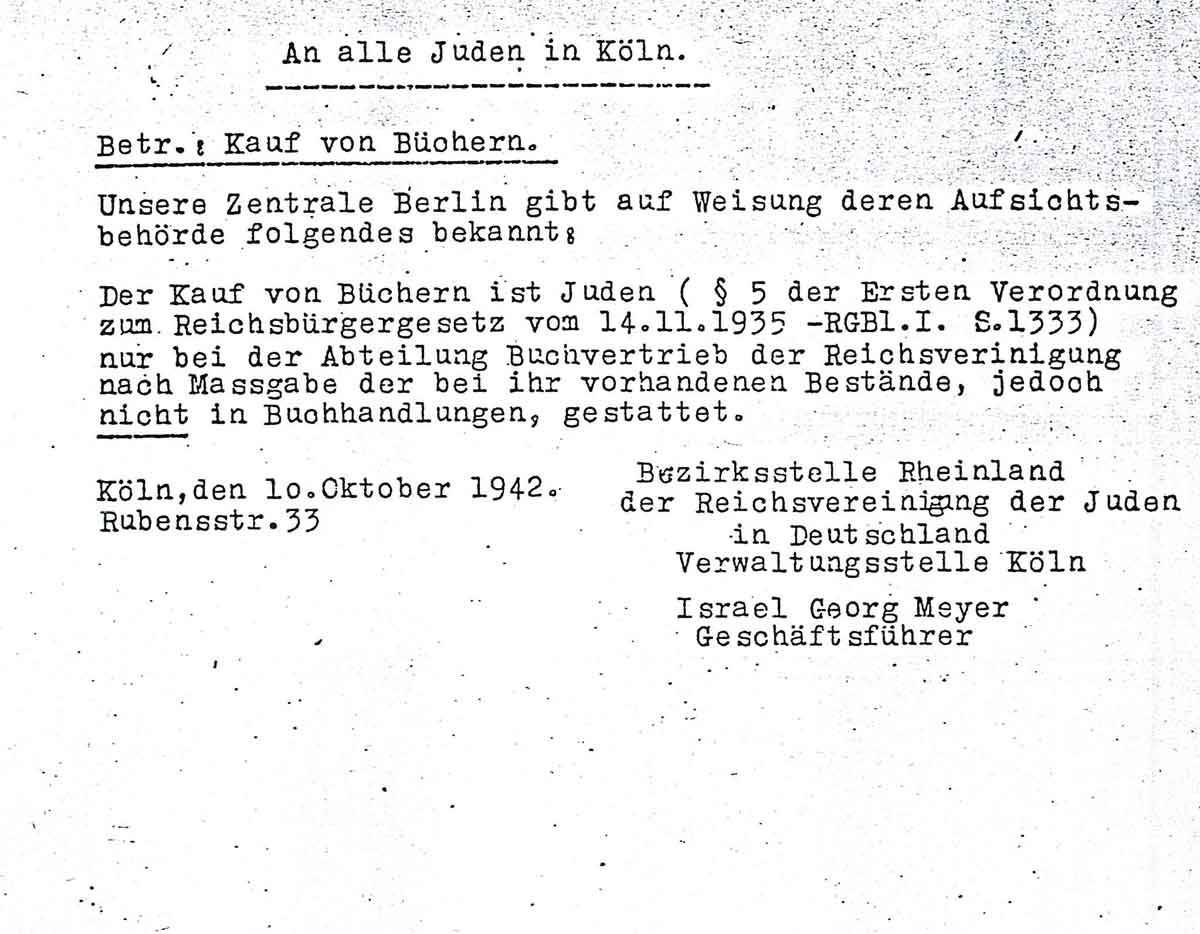 Der Kauf von Büchern ist Juden (§ 5 der Ersten Verordnung zum Reichsbürgergesetz vom 14.11.1935 - RGBl. I. S. 1333) nur bei der Abteilung Buchvertrieb der Reichsvereinigung nach Massgabe der bei ihr vorhandenen Bestände, jedoch nicht in Buchhandlungen, gestattet.
