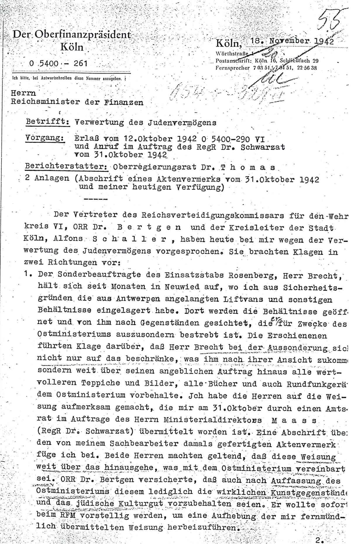 Am 18. November 1942 berichtet der Oberfinanzpräsident Köln Folgendes an das Reichsfinanzministerium: