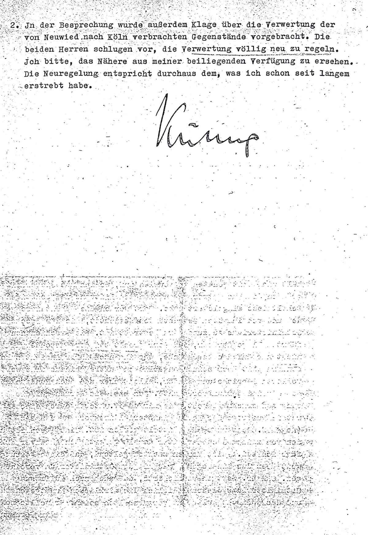 2. In der Besprechung wurde außerdem Klage über die Verwertung der von Neuwied nach Köln verbrachten Gegenstände vorgebracht. Die beiden Herren schlugen vor, die Verwertung völlig neu zu regeln. Ich bitte, das Nähere aus meiner beiliegenden Verfügung zu ersehen. Die Neuregelung entspricht durchaus dem, was ich schon seit langem erstrebt habe.