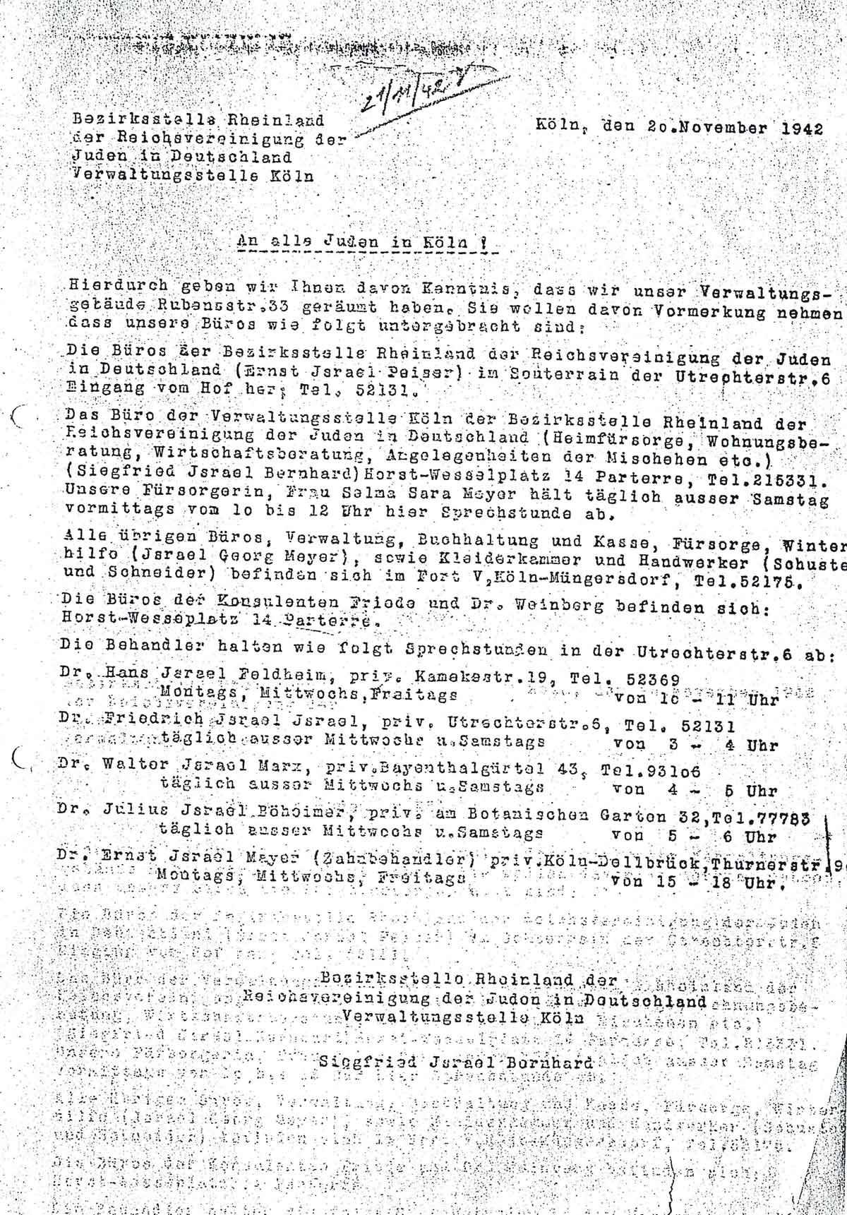 Die Bezirksstelle Rheinland der Reichsvereinigung der Juden teilt "an alle Juden in Köln" am 20. November 1942 Folgendes mit: