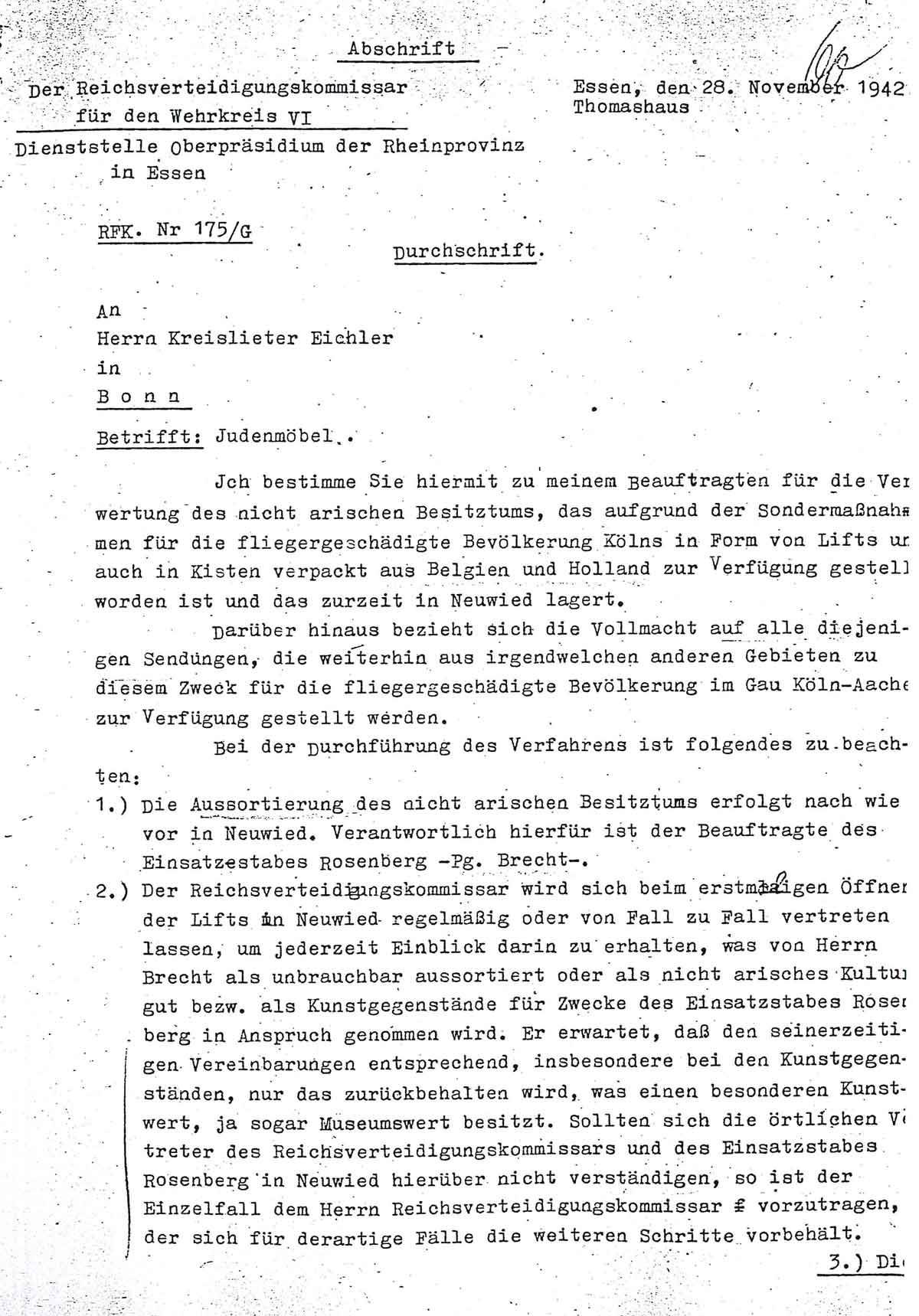 Ich bestimme Sie hiermit zu meinem Beauftragten für die Verwertung des nicht arischen Besitztums, das aufgrund der Sondermaßnahmen für die fliegergeschädigte Bevölkerung Kölns in Form von Lifts und auch in Kisten verpackt aus Belgien und Holland zur Verfügung gestellt worden ist und das zurzeit in Neuwied lagert.
