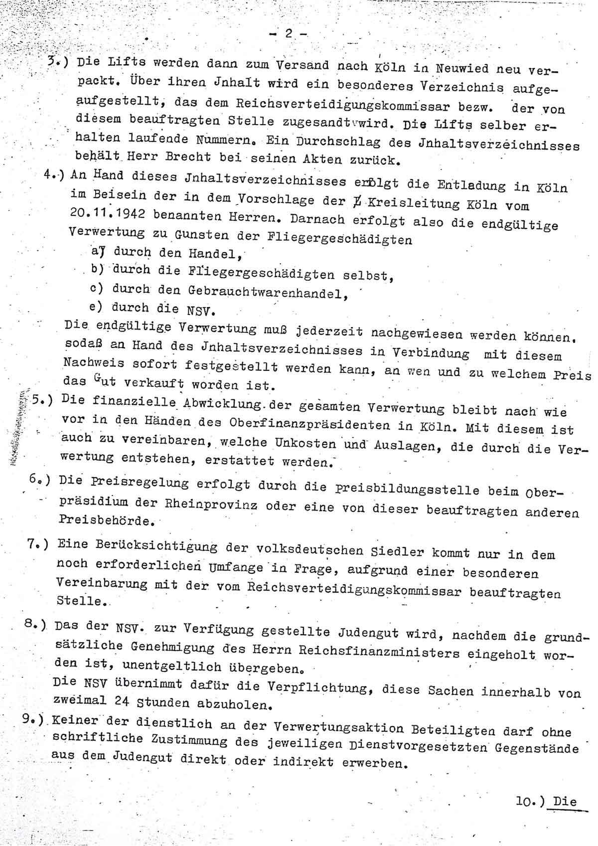 2.) Der Reichsverteidigungskommissar wird sich beim erstmaligen Öffnen der Lifts in Neuwied regelmäßig oder von Fall zu Fall vertreten lassen, um jederzeit Einblick darin zu erhalten, was von Herrn Brecht als unbrauchbar aussortiert oder als nicht arisches Kulturgut bezw. als Kunstgegenstände für Zwecke des Einsatzstabes Rosenberg in Anspruch genommen wird. Er erwartet, daß den seinerzeitigen Vereinbarungen entsprechend, insbesondere bei den Kunstgegenständen, nur das zurückbehalten wird, was einen besonderen Kunstwert, ja sogar Museumswert besitzt. Sollten sich die örtlichen Vertreter des Reichsverteidigungskommissars und des Einsatzstabes Rosenberg in Neuwied hierüber nicht verständigen, so ist der Einzelfall dem Herrn Reichsverteidigungskommissar vorzutragen, der sich für derartige Fälle die weiteren Schritte vorbehält.