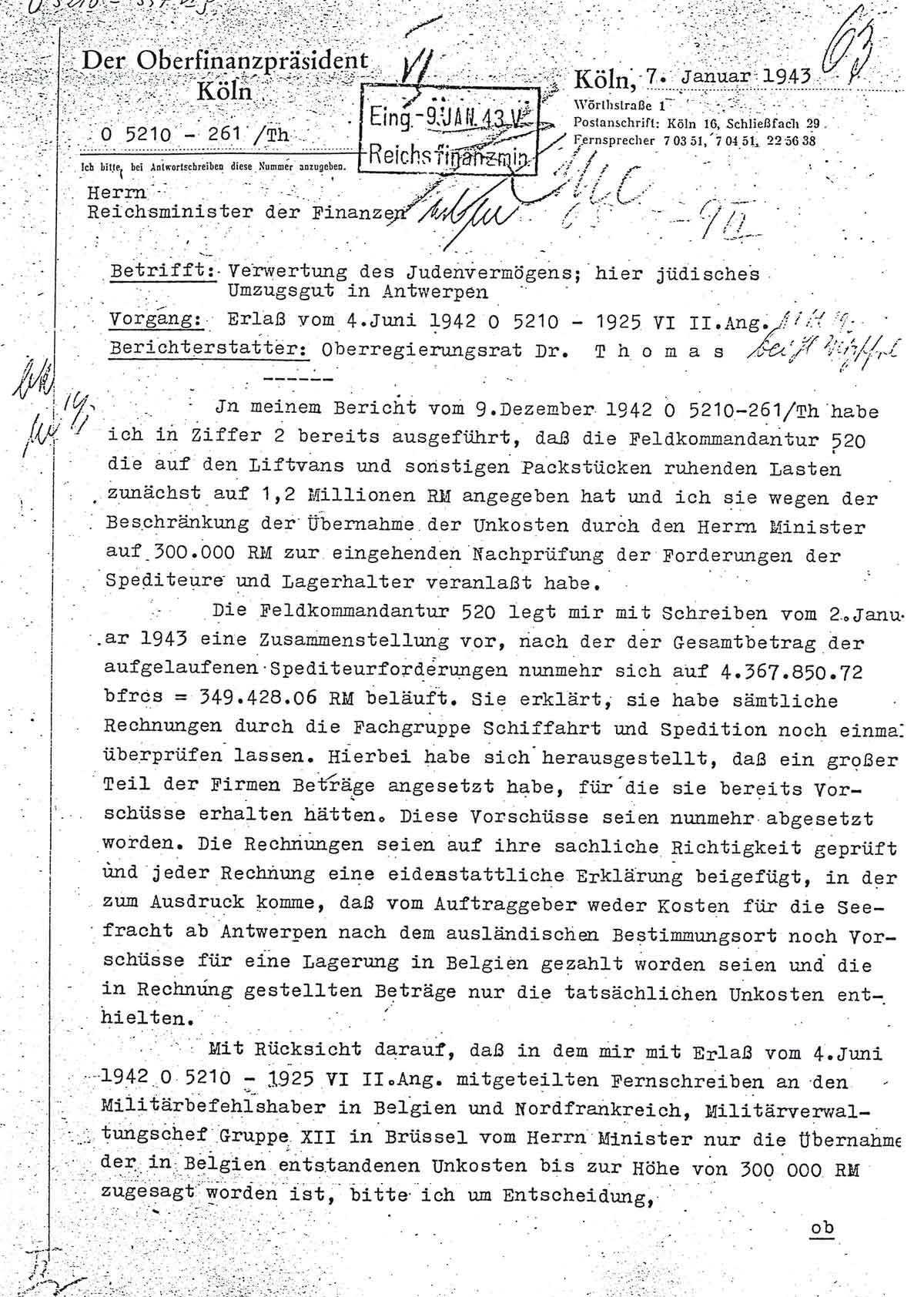 Am 7. Januar 1943 berichtet der Oberfinanzpräsident Köln Folgendes an das Reichsfinanzministerium: