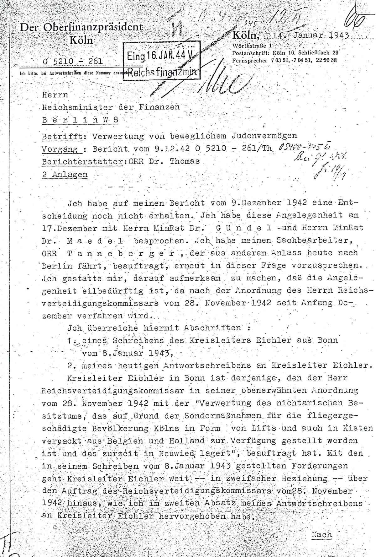 Am 14. Januar 1943 berichtet der Oberfinanzpräsident Köln Folgendes an das Reichsfinanzministerium: