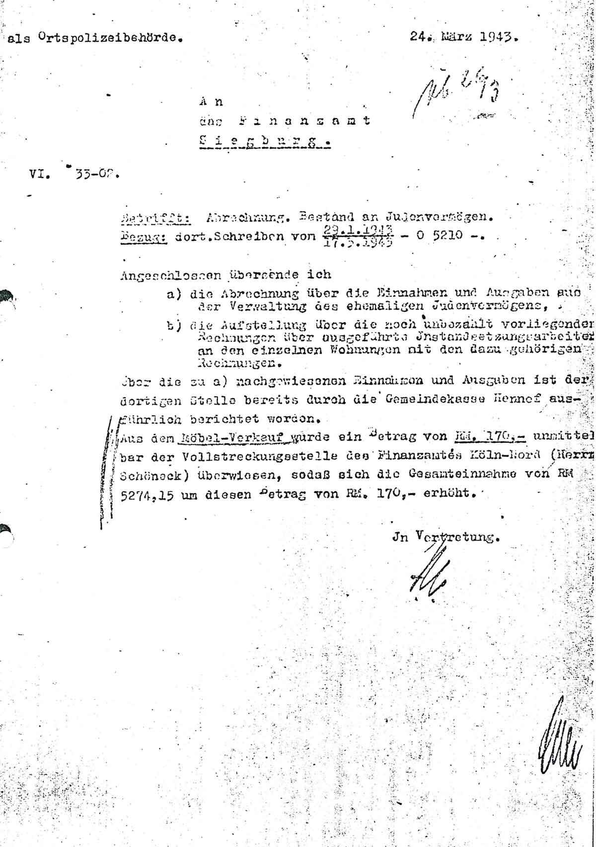 Aus dem Möbel-Verkauf wurde ein Betrag von RM. 170,- unmittelbar der Vollstreckungsstelle des Finanzamtes Köln-Nord (Herrn Schöneck) überwiesen, sodaß sich die Gesamteinnahme von RM 5274,15 um diesen Betrag von RM. 170,- erhöht.