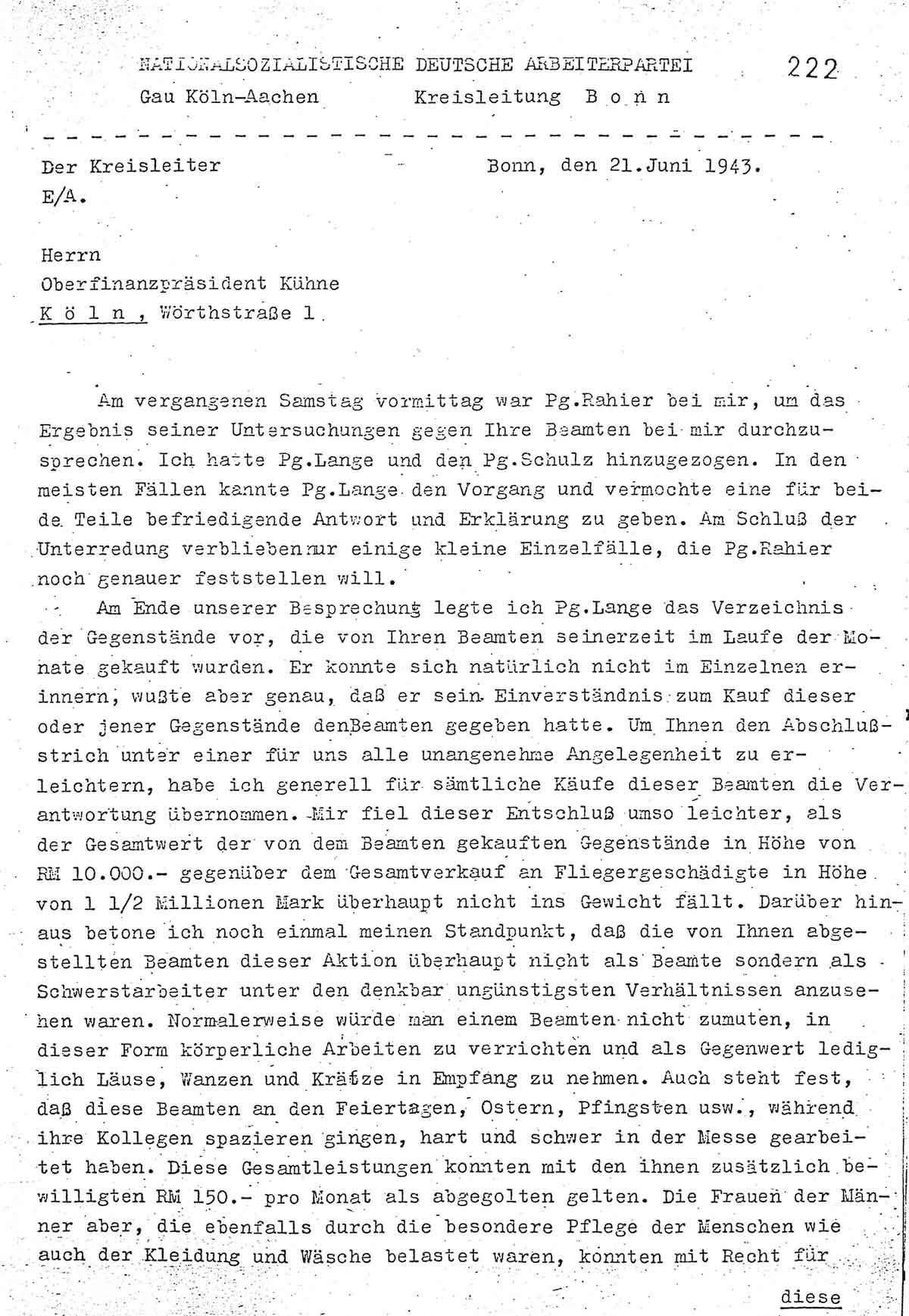 Am 21. Juni 1943 teilt der NSDAP-Kreisleiter aus Bonn dem Oberfinanzpräsidenten in Köln Folgendes mit: