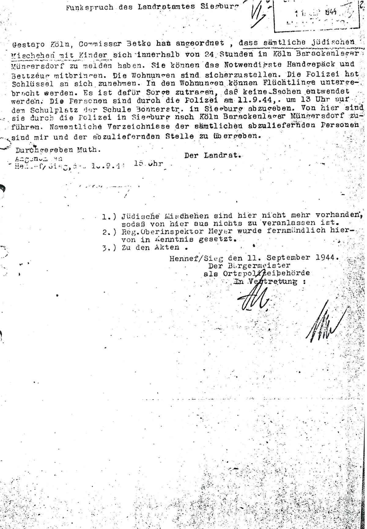 Gestapo Köln, Commissar Betke hat angeordnet, dass sämtliche jüdischen Mischehen mit Kinder sich innerhalb von 24 Stunden in Köln Barackenlager Müngersdorf zu melden haben. Sie können das Notwendigste Handgepäck und Bettzeug mitbringen. Die Wohnungen sind sicherzustellen. Die Polizei hat Schlüssel an sich zunehmen. In den Wohnungen können Flüchtlinge untergebracht werden. Es ist dafür Sorge zu tragen, daß keine Sachen entwendet werden. Die Personen sind durch die Polizei am 11.9.44, um 13 Uhr auf dem Schulplatz der Schule Bonnerstr. in Siegburg abzugeben. Von hier sind sie durch die Polizei in Siegburg nach Köln Barackenlager Müngersdorf zuführen. Namentliche Verzeichnisse der sämtlichen abzuliefernden Personen sind mir und der abzuliefernden Stelle zu übergeben.