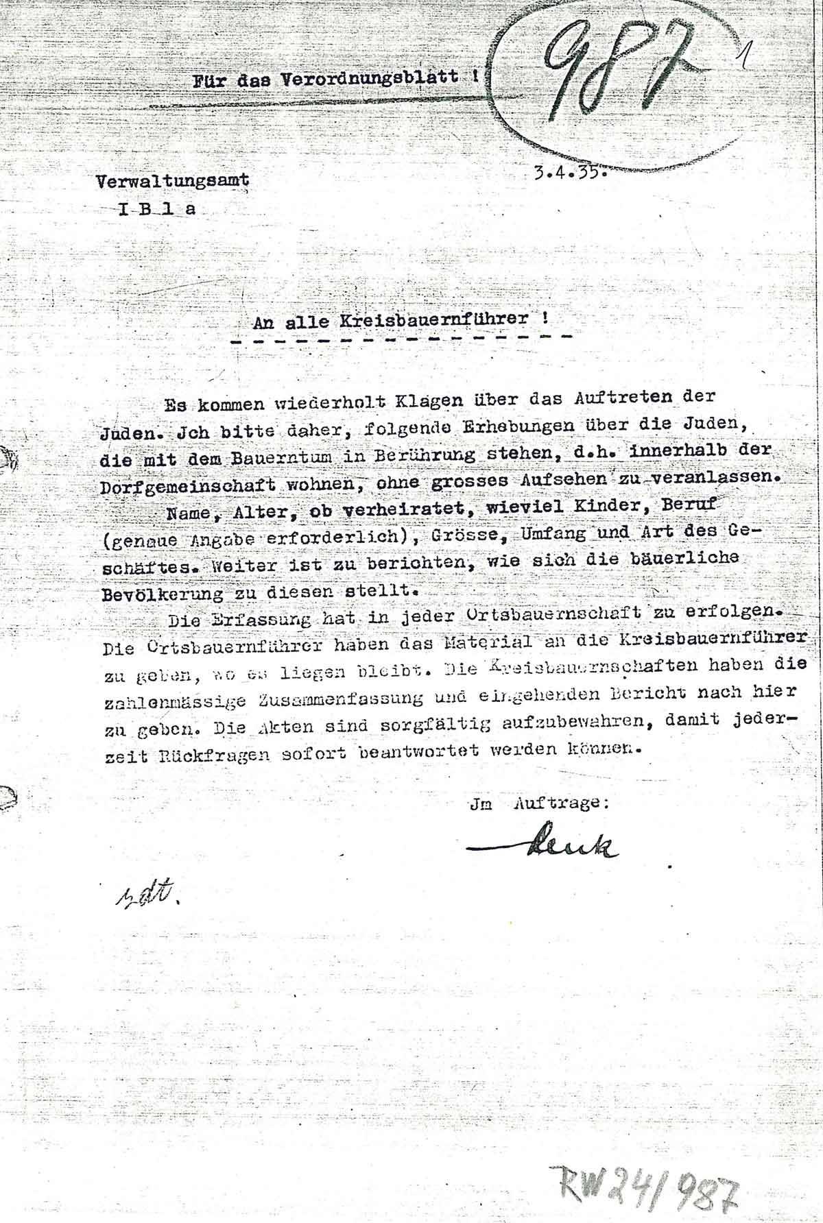 Am 3. April 1935 ergeht an alle Kreisbauernführer im NSDAP-Gau Köln-Aachen (?) folgende Aufforderung: