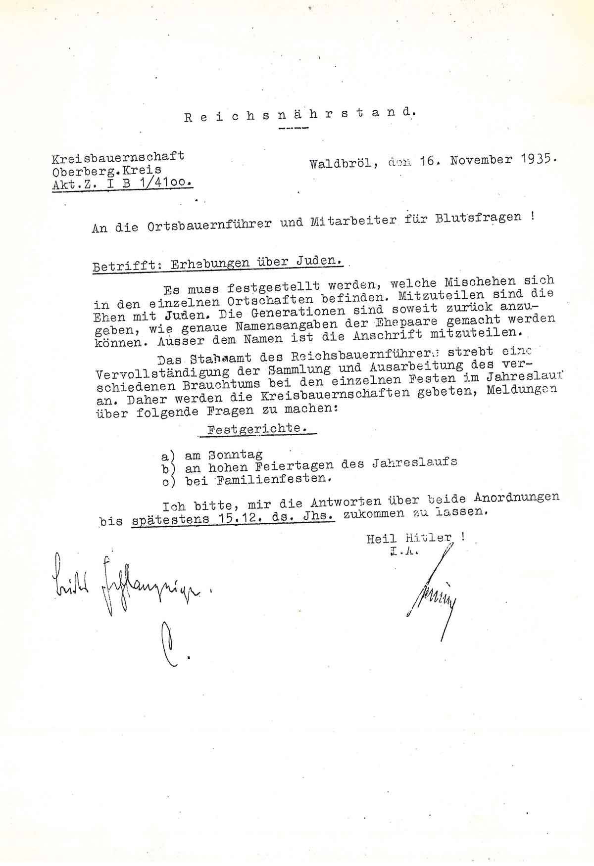 Die Kreisbauernschaft Waldbröl teilt den Ortsbauernführern am 16. November 1935 Folgendes mit: