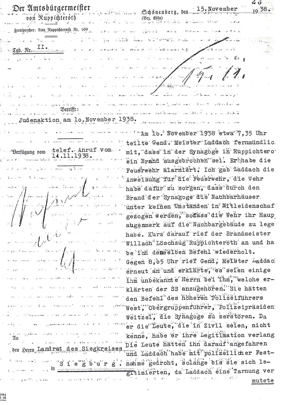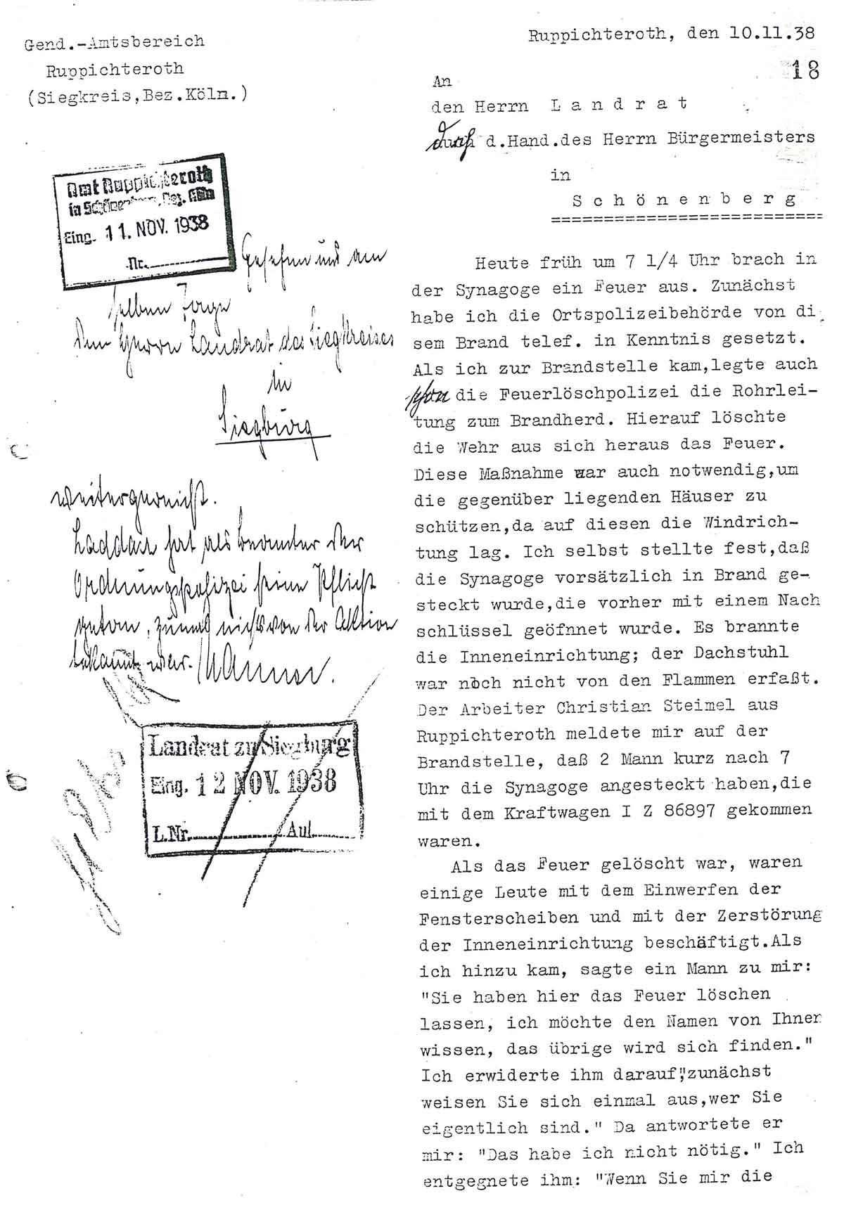 Ebenfalls am 15. November 1938 übermittelte der Ruppichterother Amtsbürgermeister dem Landrat in Siegburg folgenden Bericht über die Geschehnisse am 10. November 1938: