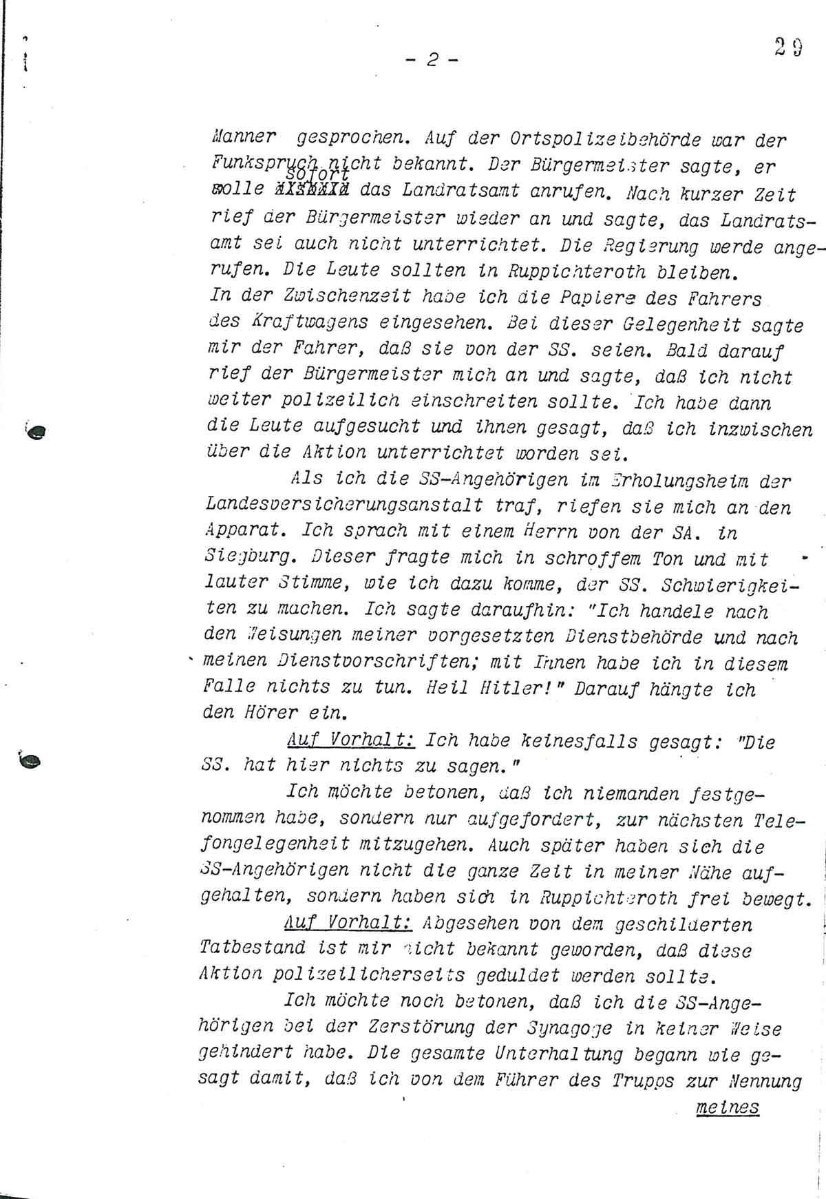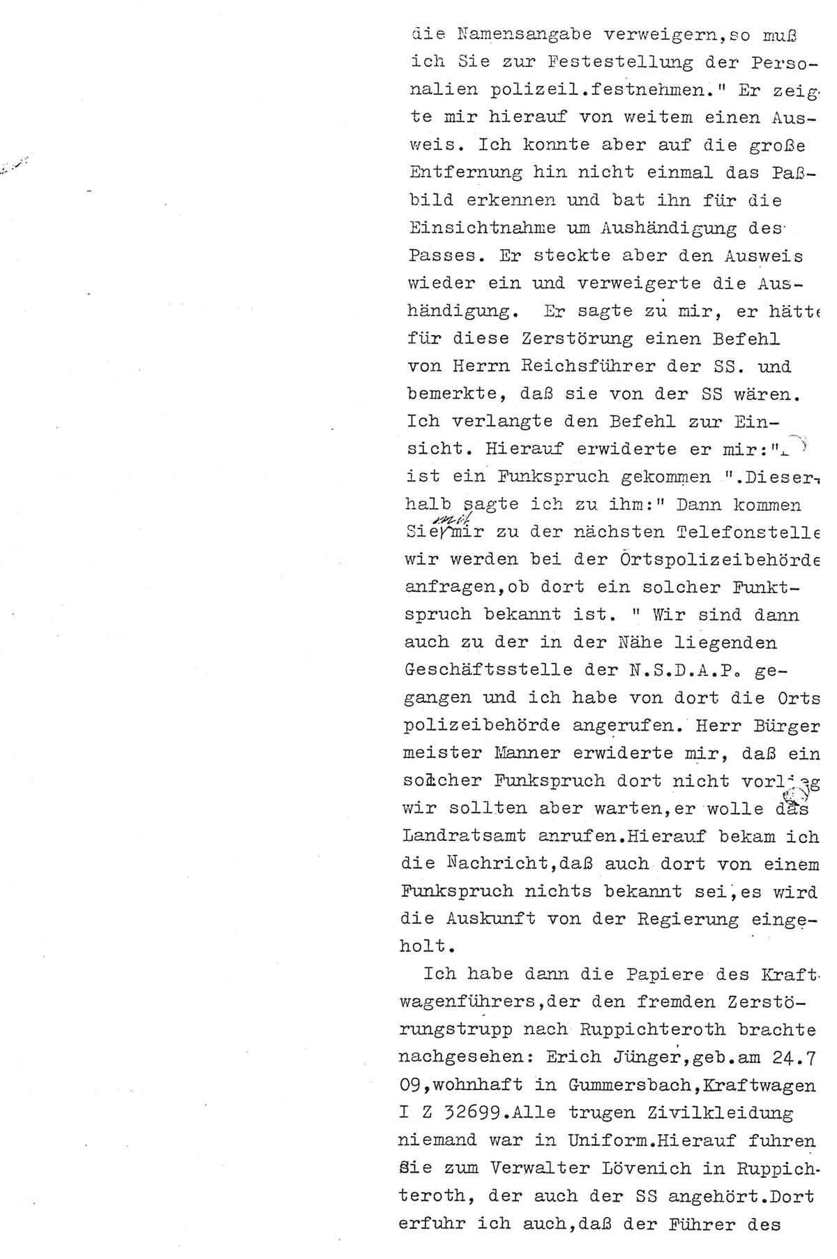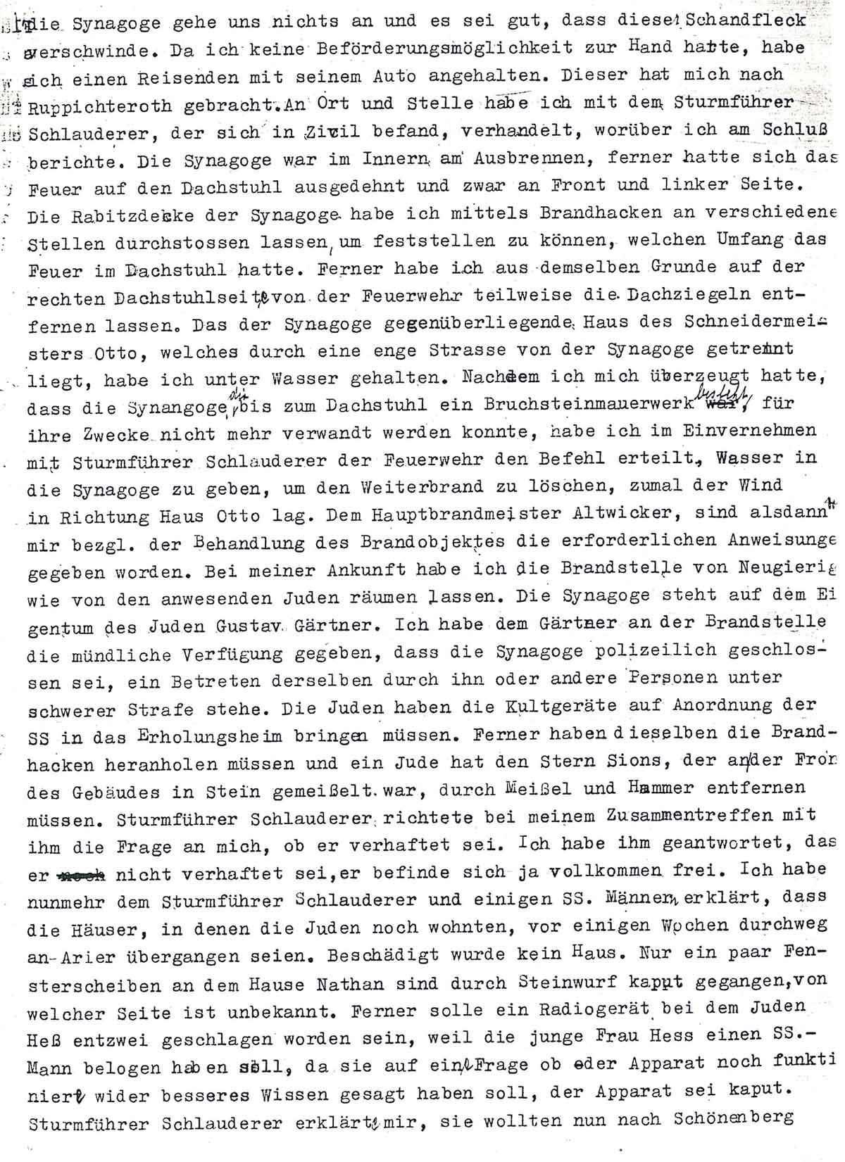 Die Synagoge gehe uns nichts an und es sei gut, dass dieser Schandfleck verschwinde. Da ich keine Beförderungsmöglichkeit zur Hand hatte, habe ich einen Reisenden mit seinem Auto angehalten. Dieser hat mich nach Ruppichteroth gebracht. An Ort und Stelle habe ich mit dem Sturmführer Schlauderer, der sich in Zivil befand, verhandelt, worüber ich am Schluß berichte. Die Synagoge war im Innern am Ausbrennen, ferner hatte sich das Feuer auf den Dachstuhl ausgedehnt und zwar an Front und linker Seite. Die Rabitzdecke der Synagoge habe ich mittels Brandhacken an verschiedenen Stellen durchstossen lassen, um feststellen zu können, welchen Umfang das Feuer im Dachstuhl hatte. Ferner habe ich aus demselben Grunde auf der rechten Dachstuhlseite von der Feuerwehr teilweise die Dachziegeln entfernen lassen. Das der Synagoge gegenüberliegende Haus des Schneidermeisters Otto, welches durch eine enge Strasse von der Synagoge getrennt liegt, habe ich unter Wasser gehalten. Nachdem ich mich überzeugt hatte, dass die Synagoge, die bis zum Dachstuhl ein Bruchsteinmauerwerk besteht, für ihre Zwecke nicht mehr verwandt werden konnte, habe ich im Einvernehmen mit Sturmführer Schlauderer der Feuerwehr den Befehl erteilt, Wasser in die Synagoge zu geben, um den Weiterbrand zu löschen, zumal der Wind in Richtung Haus Otto lag. Dem Hauptbrandmeister Altwicker, sind alsdann von mir bezgl. der Behandlung des Brandobjektes die erforderlichen Anweisungen gegeben worden. Bei meiner Ankunft habe ich die Brandstelle von Neugierigen wie von den anwesenden Juden räumen lassen. Die Synagoge steht auf dem Eigentum des Juden Gustav Gärtner. Ich habe dem Gärtner an der Brandstelle die mündliche Verfügung gegeben, dass die Synagoge polizeilich geschlossen sei, ein Betreten derselben durch ihn oder andere Personen unter schwerer Strafe stehe. Die Juden haben die Kultgeräte auf Anordnung der SS in das Erholungsheim bringen müssen. Ferner haben dieselben die Brandhacken heranholen müssen und ein Jude hat den Stern Sions, der an der Front des Gebäudes in Stein gemeißelt war, durch Meißel und Hammer entfernen müssen. Sturmführer Schlauderer richtete bei meinem Zusammentreffen mit ihm die Frage an mich, ob er verhaftet sei. Ich habe ihm geantwortet, dass er nicht verhaftet sei, er befinde sich ja vollkommen frei. Ich habe nunmehr dem Sturmführer Schlauderer und einigen SS. Männern erklärt, dass die Häuser, in denen die Juden noch wohnten, vor einigen Wochen durchweg an Arier übergangen seien. Beschädigt wurde kein Haus. Nur ein paar Fensterscheiben an dem Hause Nathan sind durch Steinwurf kaput gegangen, von welcher Seite ist unbekannt. Ferner solle ein Radiogerät bei dem Juden Heß entzwei geschlagen worden sein, weil die junge Frau Hess einen SS.-Mann beloben haben soll, da sie auf eine Frage ob der Apparat noch funktioniere wider besseres Wissen gesagt haben soll, der Apparat sei kaput. Sturmführer Schlauderer erklärte mir, sie wollten nun nach Schönenberg