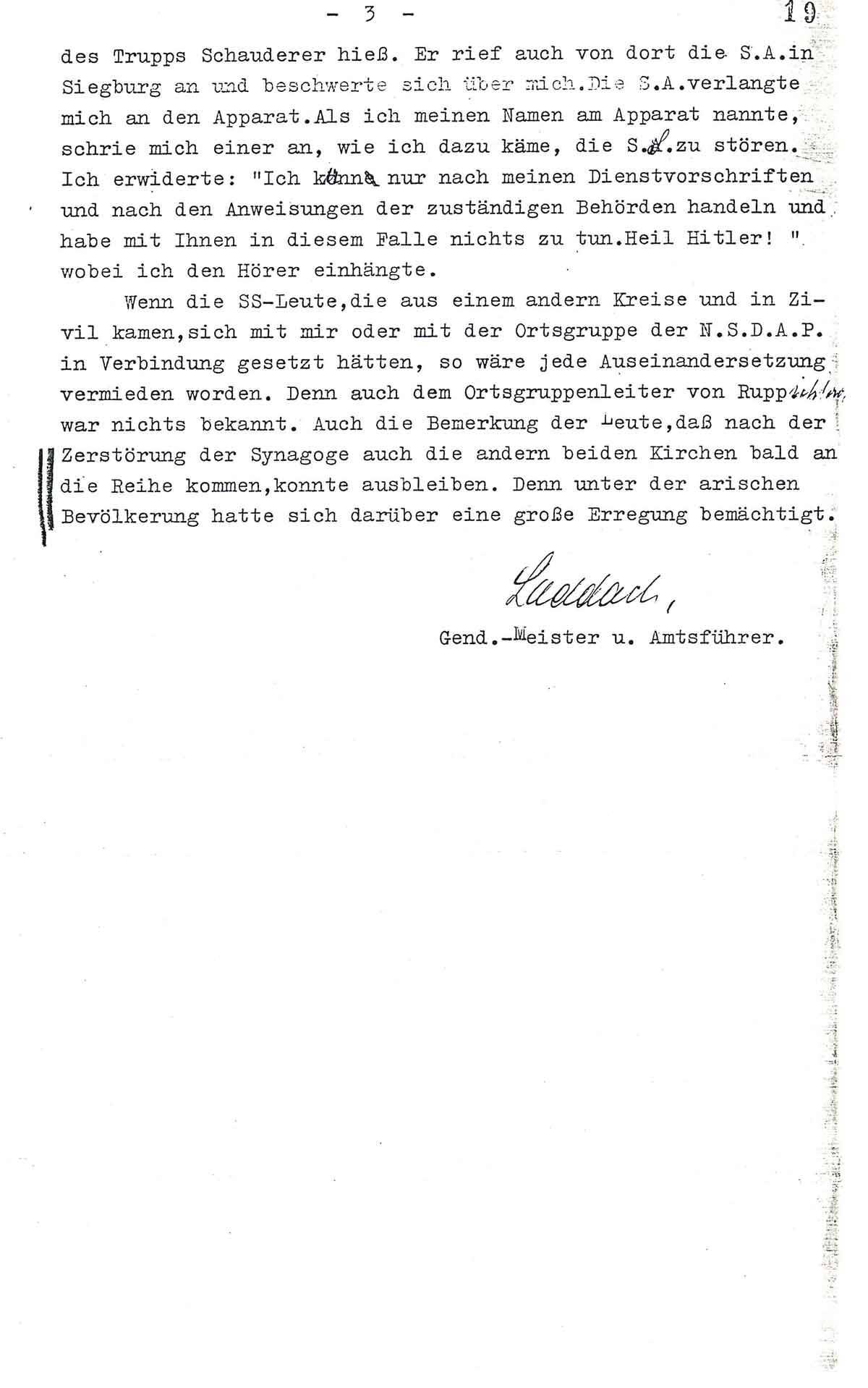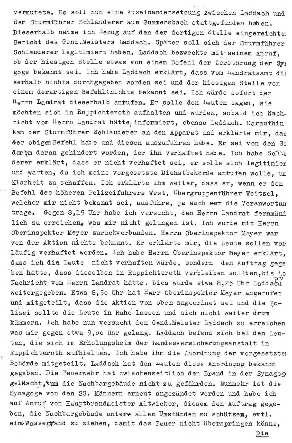 vermutete. Es soll nun eine Auseinandersetzung zwischen Laddach und dem Sturmführer Schlauderer aus Gummersbach stattgefunden haben. Dieserhalb nehme ich Bezug auf den der dortigen Stelle eingereichten Bericht des Gend.Meisters Laddach. Später soll sich der Sturmführer Schlauderer legitimiert haben. Laddach bezweckte mit seinem Anruf, ob der hiesigen Stelle etwas von einem Befehl der Zerstörung der Synagoge bekannt sei. Ich habe Laddach erklärt, dass vom Landratsamt dieserhalb nichts durchgegeben worden sei und der hiesigen Stelle von einem derartigen Befehl nichts bekannt sei. Ich würde sofort den Herrn Landrat dieserhalb anrufen. Er solle den Leuten sagen, sie möchten sich in Ruppichteroth aufhalten und würden, sobald ich Nachricht vom Herrn Landrat hätte, informiert, ebenso Laddach. Daraufhin kam der Sturmführer Schlauderer an den Apparat und erklärte mir, dass er obigen Befehl habe und diesen auszuführen habe. Er sei von den Gendarm daran gehindert worden, der ihn verhaftet habe. Ich habe Schlauderer erklärt, dass er nicht verhaftet sei, er solle sich legitimieren und warten, da ich meine vorgesetzte Dienstbehörde anrufen wolle, um Klarheit zu schaffen. Ich erklärte ihm weiter, dass er, wenn er den Befehl des höheren Polizeiführers West, Obergruppenführer Weitzel, welcher mir nicht bekannt sei, ausführe, ja auch die Verantwortung trage. Gegen 8,15 Uhr habe ich versucht, den Herrn Landrat fernmündlich zu erreichen, was mir nicht gelungen ist. Ich wurde mit Herrn Oberinspektor Meyer zurückverbunden. Herrn Oberinspektor Meyer war von der Aktion nichts bekannt. Er erklärte mir, die Leute sollen vorläufig verhaftet werden. Ich habe Herrn Oberinspektor Meyer erklärt, dass ich die Leute nicht verhaften würde, sondern den Auftrage gegeben hätte, dass dieselben in Ruppichteroth verbleiben sollten, bis ich Nachricht vom Herrn Landrat hätte. Dies wurde etwa 8,25 Uhr Laddach weitergegeben. Etwa 8,50 Uhr hat Herr Oberinspektor Meyer angerufen und mitgeteilt, dass die Aktion von oben angeordnet sei und die Polizei sollte die Leute in Ruhe lassen und sich nicht weiter drum kümmern. Ich habe nun versucht den Gend.Meister Laddach zu erreichen was mir gegen etwa 9,00 Uhr gelang. Laddach befand sich bei den Leuten, die sich im Erholungsheim der Landesversicherungsanstalt in Ruppichteroth aufhielten. Ich habe ihm die Anordnung der vorgesetzten Behörde mitgeteilt. Laddach hat den Leuten diese Anordnung bekannt gegeben. Die Feuerwehr hat zwischenzeitlich den Brand in der Synagoge gelöscht, um die Nachbargebäude nicht zu gefährden. Nunmehr ist die Synagoge von den SS. Männern erneut angezündet worden und habe ich auf Anruf von Hauptbrandmeister Altwicker, diesem den Auftrag gegeben, die Nachbargebäude unter allen Umständen zu schützen, evtl. eine Wasserwand zu ziehen, damit das Feuer nicht überspringen könne.