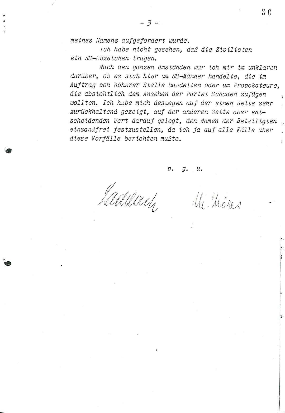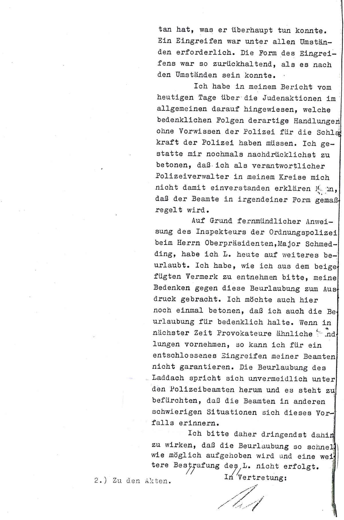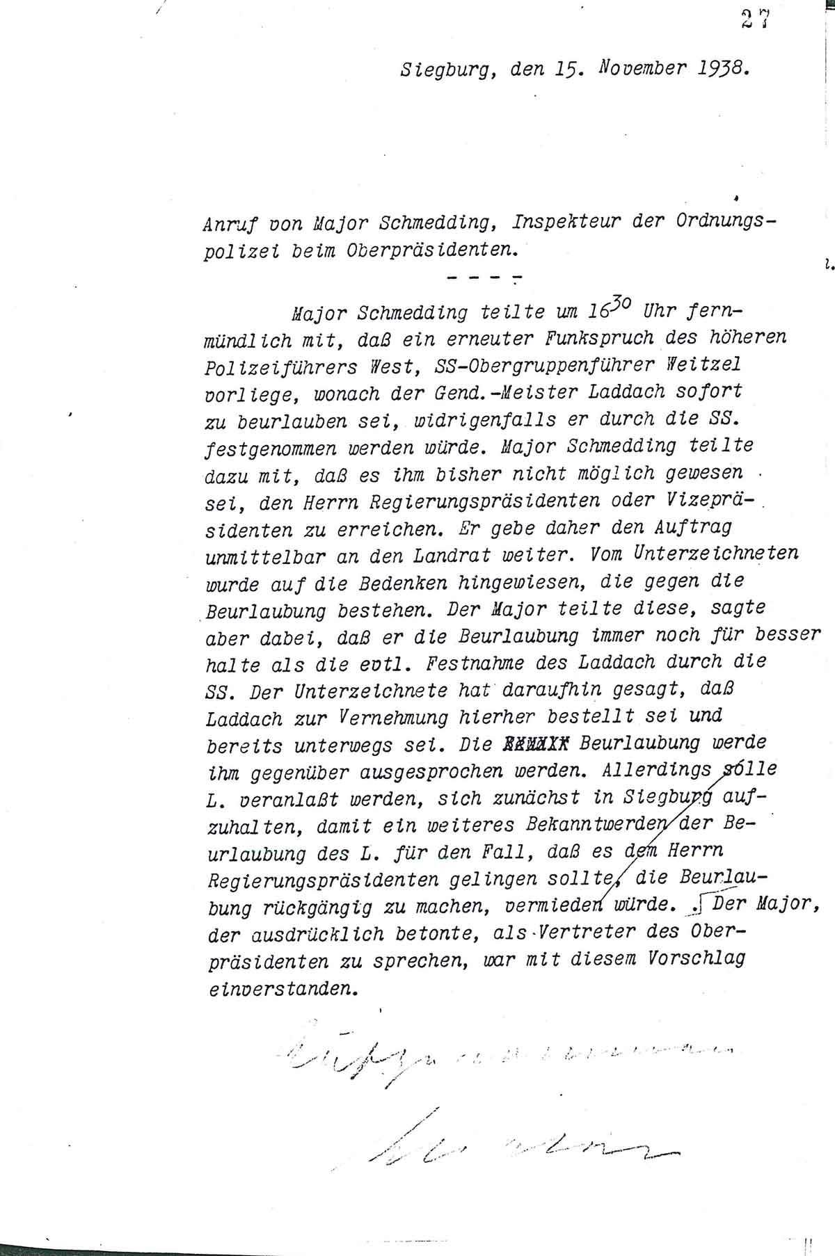 Gegen 8,05 Uhr rief Gend. Meister Laddach erneut an und erklärte, es seien einige ihm ungekannte Herrn bei ihm, welche erklärten der SS anzugehören. Sie hätten den Befehl des höheren Polizeiführers West, Obergruppenführer, Polizeirpräsident Weitzel, die Synagoge zu zerstören. Da er die Leute, die in Zivil seien, nicht kenne, habe er ihre Legitimation verlangt. Die Leute hätten ihn darauf angefahren und Laddach habe mit polizeilicher Festnahme gedroht, solange bis sie sich sich legitimierten, da Laddach einen Tarnung