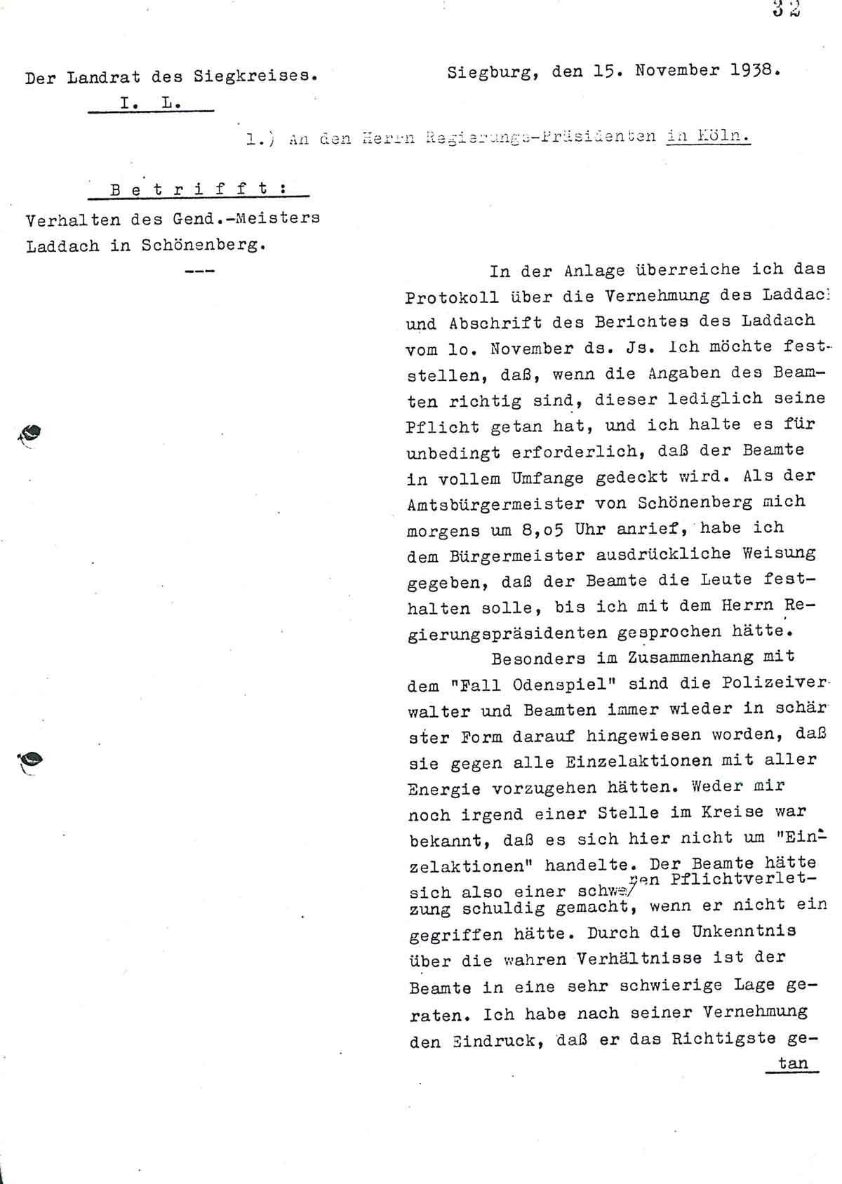 Die Meldung über die Verhaftung und dem Abtransport der 5 Juden habe ich am 10. November 1938 etwa 3,55 Uhr nachmittags Herr Reg. Insp. Esser persönlich überreicht. Von einem fernmündlichen Anruf meinerseits an das Landratsamt am 10.11.1938, nach 11,50 Uhr ist mir nichts bekannt.