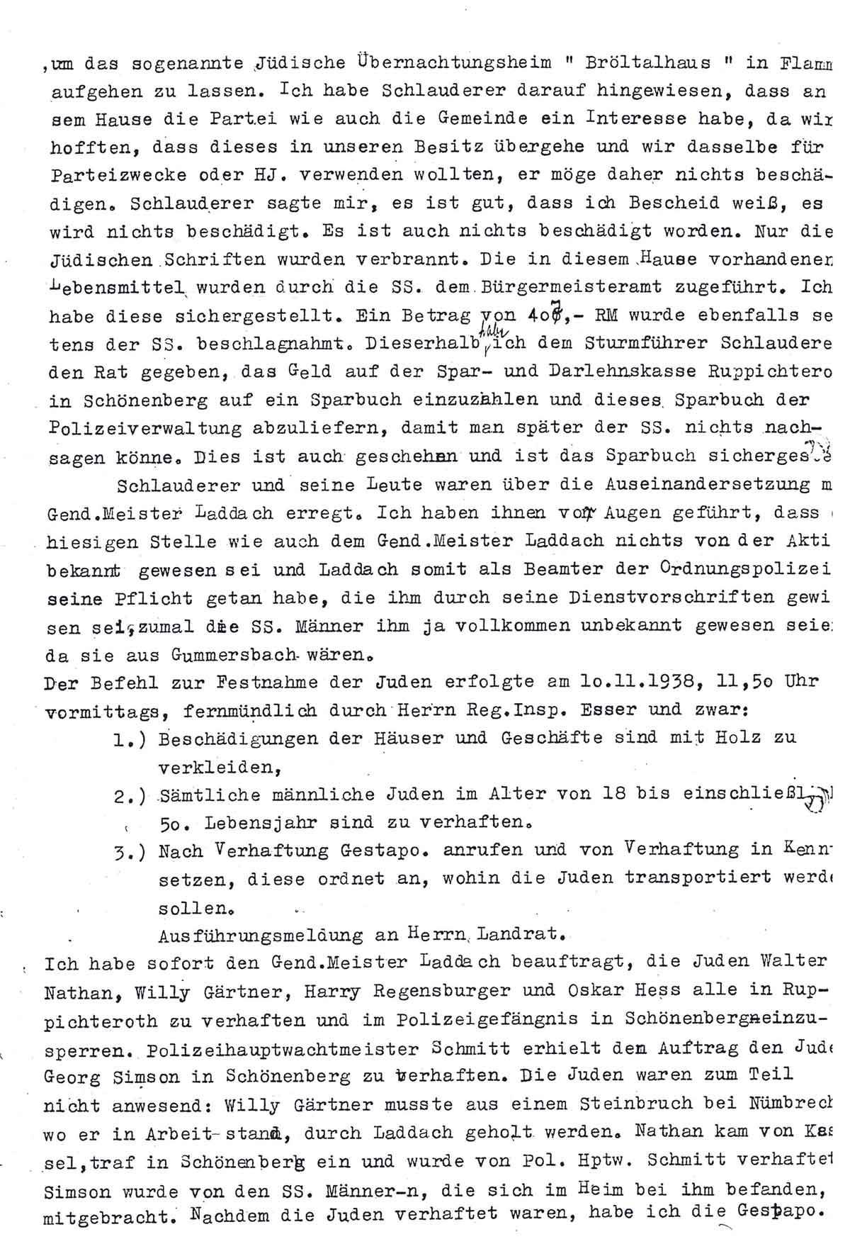 Ich habe sofort den Gend.Meister Laddach beauftragt, die Juden Walter Nathan, Willy Gärtner, Harry Regensburger und Oskar Hess alle in Ruppichteroth zu verhaften und im Polizeigefängnis in Schönenberg einzusperren. Polizeihauptwachtmeister Schmitt erhielt den Auftrag den Juden Georg Simson in Schönenberg zu verhaften. Die Juden waren zum Teil nicht anwesend: Willy Gärtner musste aus einem Steinbruch bei Nümbrecht, wo er in Arbeit stand, durch Laddach geholt werden. Nathan kam von Kassel, traf in Schönenberg ein und wurde von Pol. Hptw. Schmitt verhaftet. Simson wurde von den SS. Männern, die sich im Heim bei ihm befanden, mitgebracht. Nachdem die Juden verhaftet waren, habe ich die Gestapo.