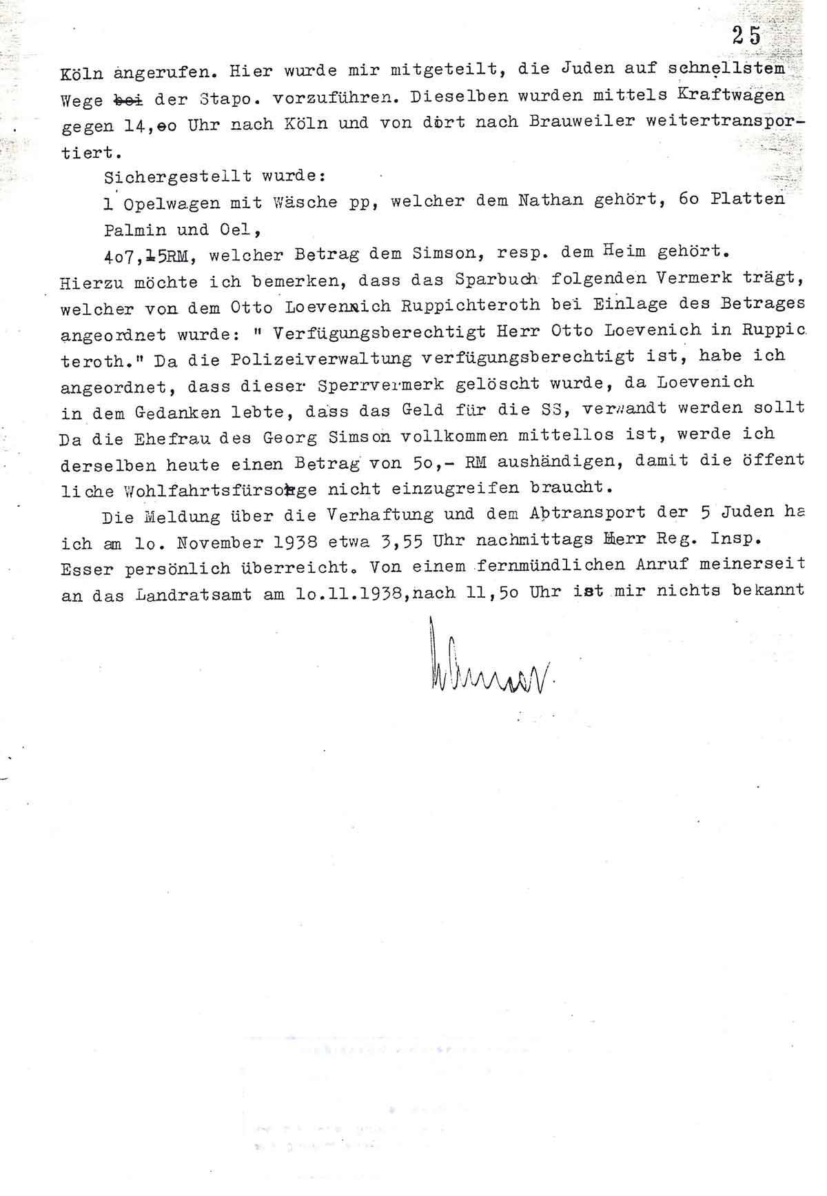Hierzu möchte ich bemerken, dass das Sparbuch folgenden Vermerk trägt, welcher von dem Otto Loevenich Ruppichteroth bei Einlage des Betrages angeordnet wurde: „Verfügungsberechtigt Herr Otto Loevenich in Ruppichteroth.” Da die Polizeiverwaltung verfügungsberechtigt ist, habe ich angeordnet, dass dieser Sperrvermerk gelöscht wurde, da Loevenich in dem Gedanken lebte, dass das Geld für die SS. verwandt werden sollte. Da die Ehefrau des Georg Simson vollkommen mittellos ist, werde ich derselben heute einen Betrag von 50,- RM aushändigen, damit die öffentliche Wohlfahrtsfürsorge nicht einzugreifen braucht.