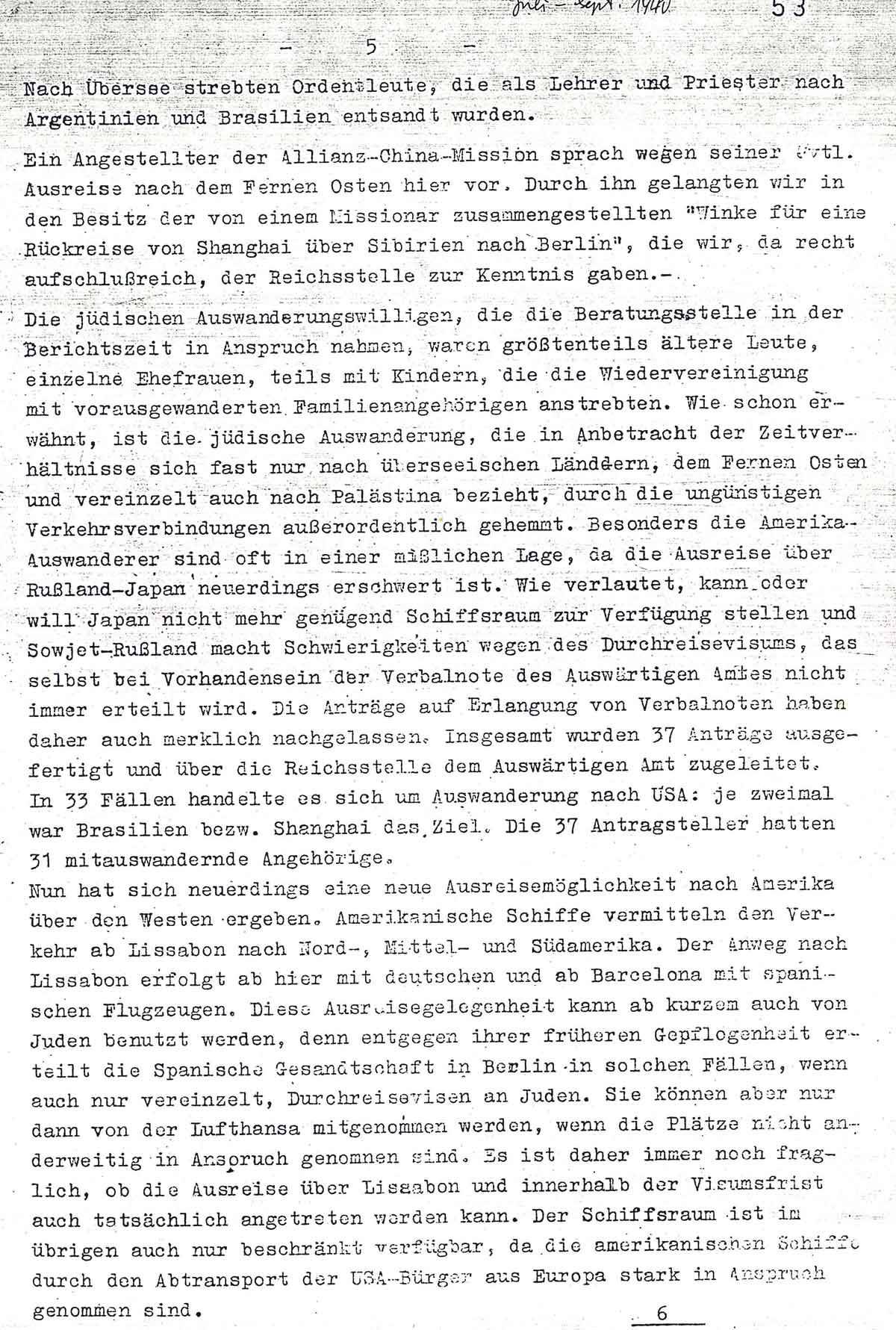 Nun hat sich neuerdings eine neue Ausreisemöglichkeit nach Amerika über den Westen ergeben. Amerikanische Schiffe vermitteln den Verkehr ab Lissabon nach Nord-, Mittel- und Südamerika. Der Anweg nach Lissabon erfolgt ab hier mit deutschen und ab Barcelona mit spanischen Flugzeugen. Diese Ausreisegelegenheit kann ab kurzem auch von Juden benutzt werden, denn entgegen ihrer früheren Gepflogenheit erteilt die Spanische Gesandtschaft in Berlin in solchen Fällen, wenn auch nur vereinzelt, Durchreisevisen an Juden. Sie können aber nur dann von der Lufthansa mitgenommen werden, wenn die Plätze nicht anderweitig in Anspruch genommen sind. Es ist daher immer noch fraglich, ob die Ausreise über Lissabon und innerhalb der Visumsfrist auch tatsächlich angetreten werden kann. Der Schiffsraum ist im übrigen auch nur beschränkt verfügbar, da die amerikanischen Schiffe durch den Abtransport der USA-Bürger aus Europa stark in Anspruch genommen sind.