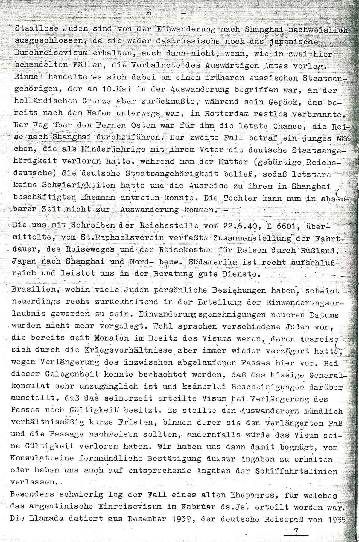 Staatlose Juden sind von der Einwanderung nach Shanghai nachweislich ausgeschlossen, da sie weder das russische noch das japanische Durchreisevisum erhalten, auch dann nicht, wenn, wie in zwei hier behandelten Fällen, die Verbalnote des Auswärtigen Amtes vorlag. Einmal handelte es sich dabei um einen früheren russischen Staatsangehörigen, der am 10. Mai in der Auswanderung begriffen war, an der holländischen Grenze aber zurückmußte, während sein Gepäck, das bereits nach dem Hafen unterwegs war, in Rotterdam restlos verbrannte. Der Weg über den Fernen Osten war für ihn die letzte Chance, die Reise nach Shanghai durchzuführen. Der zweite Fall betraf ein junges Mädchen, die als Minderjährige mit ihrem Vater die deutsche Staatsangehörigkeit verloren hatte, während man der Mutter (gebürtige Reichsdeutsche) die deutsche Staatsangehörigkeit beließ, sodaß letztere keine Schwierigkeiten hatte und die Ausreise zu ihrem in Shanghei beschäftigten Ehemann antreten konnte. Die Tochter kann nun in absehbarer Zeit nicht zur Auswanderung kommen. -