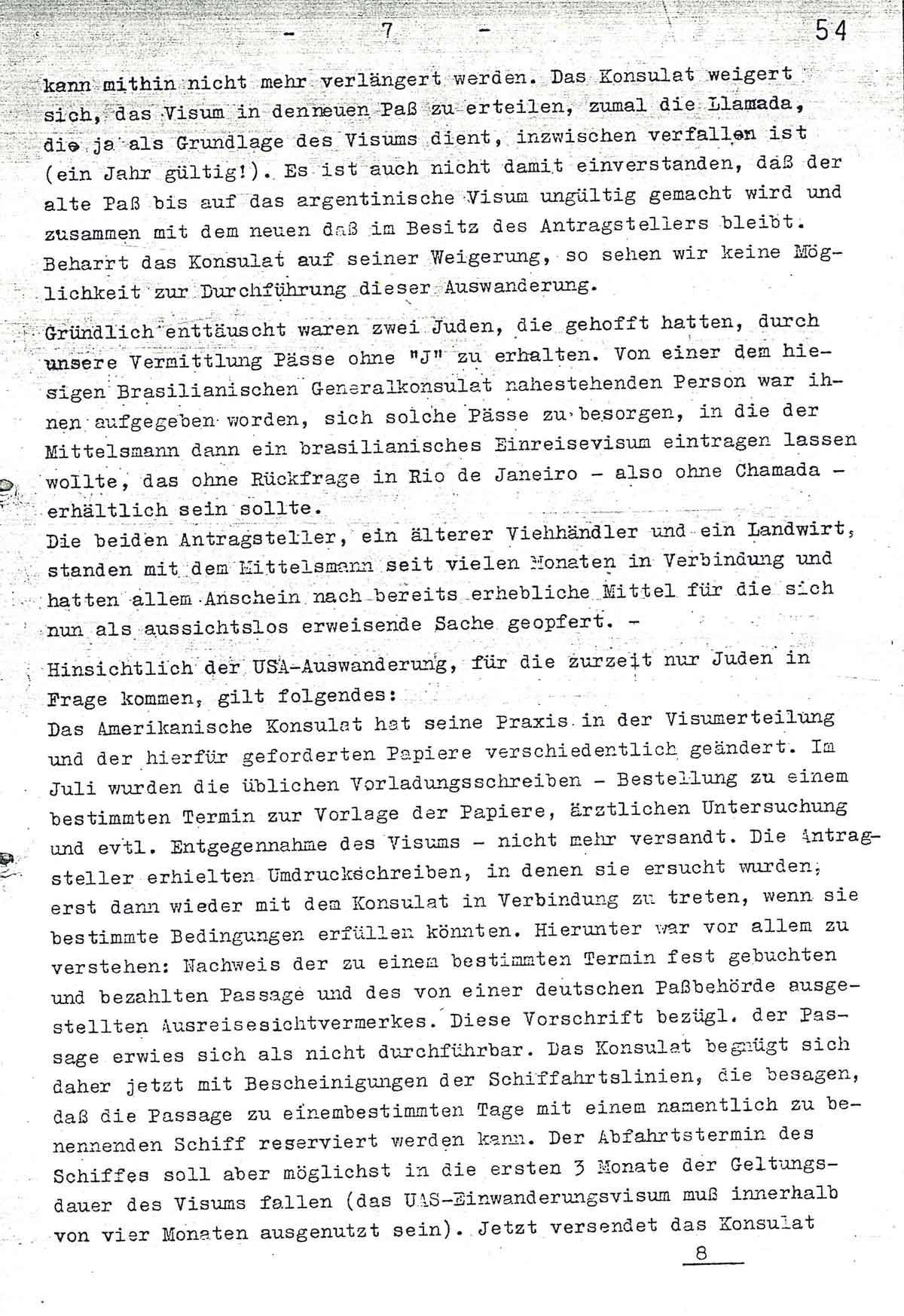Gründlich enttäuscht waren zwei Juden, die gehofft hatten, durch unsere Vermittlung Pässe ohne „J” zu erhalten. Von einer dem hiesigen Brasilianischen Generalkonsulat nahestehenden Person war ihnen aufgegeben worden, sich solche Pässe zu besorgen, in die der Mittelsmann dann ein brasilianisches Einreisevisum eintragen lassen wollte, das ohne Rückfrage in Rio de Janeiro - also ohne Chamada - erhältlich sein sollte.