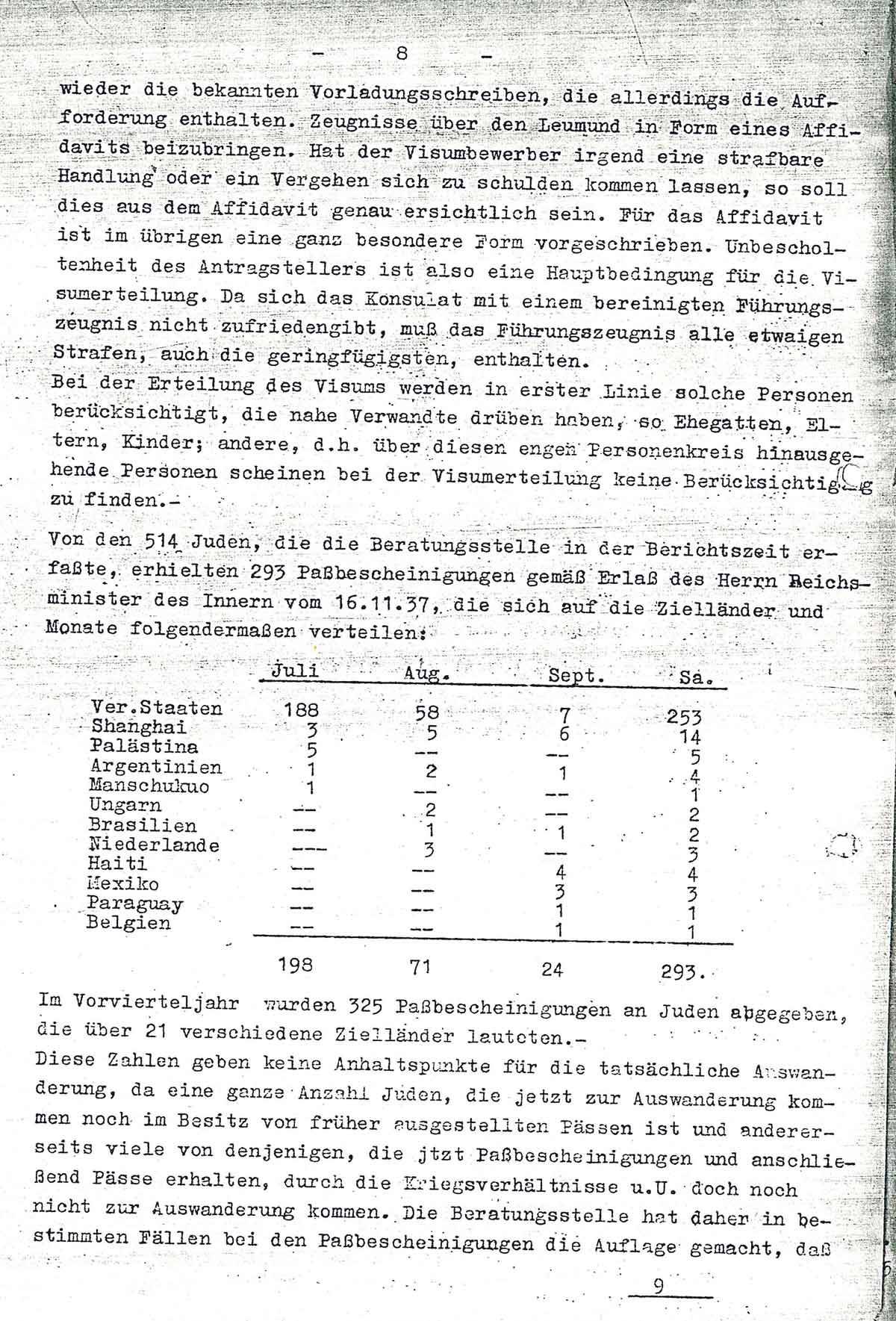 Von den 514 Juden, die die Beratungsstelle in der Berichtszeit erfaßte, erhielten 293 Paßbescheinigungen gemäß Erlaß des Herrn Reichsminister des Innern vom 16.11.37, die sich auf die Zielländer und Monate folgendermaßen verteilen: