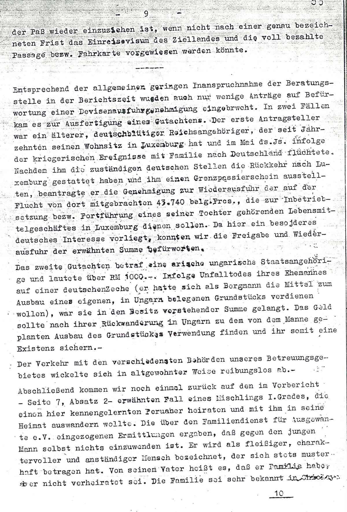 Entsprechend der allgemeinen geringen Inanspruchnahme der Beratungsstelle in der Berichtszeit wurden auch nur wenige Anträge auf Befürwortung einer Devisenausfuhrgenehmigung eingebracht. In zwei Fällen kam es zur Ausfertigung eines Gutachtens. Der erste Antragsteller war ein älterer, deutschblütiger Reichsangehöriger, der seit Jahrzehnten seinen Wohnsitz in Luxemburg hat und im Mai ds. Js. infolge der kriegerischen Ereignisse mit Familie nach Deutschland flüchtete. Nachdem ihm die zuständigen deutschen Stellen die Rückkehr nach Luxemburg gestattet haben und ihm einen Grenzpassierschein aussstellten, beantragte er die Genehmigung zur Wiederausfuhr der auf der Flucht von dort mitgebrachten 43.740 belg. Frcs., die zur Inbetriebsetzung bezw. Fortführung eines seiner Tochter gehörenden Lebensmittelgeschäftes in Luxemburg dienen sollen. Da hier ein besonderes deutsches Interesse vorliegt, konnten wir die Freigabe und Wiederausfuhr der erwähnten Summe befürworten.