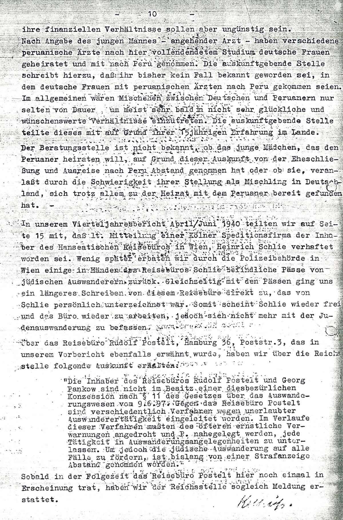„Der Inhaber des Reisebüros Rudolf Postelt und Georg Pankow sind nicht im Besitz einer diesbezüglichen Konzession nach § 11 des Gesetzes über das Auswanderungswesen vom 9.6.97[?]. Gegen das Reisebüro Postelt sind verschiedentlich Verfahren wegen unerlaubter Auswanderertätigkeit eingeleitet worden. Im Verlaufe dieser Verfahren mußten des öfteren ernstliche Verwarnungen angedroht und P. nahegelegt werden, jede Tätigkeit in Auswanderungsangelegenheiten zu unterlassen. Um jedoch die jüdische Auswanderung auf alle Fälle zu fördern, ist bislang von einer Strafanzeige Abstand genommen worden.”