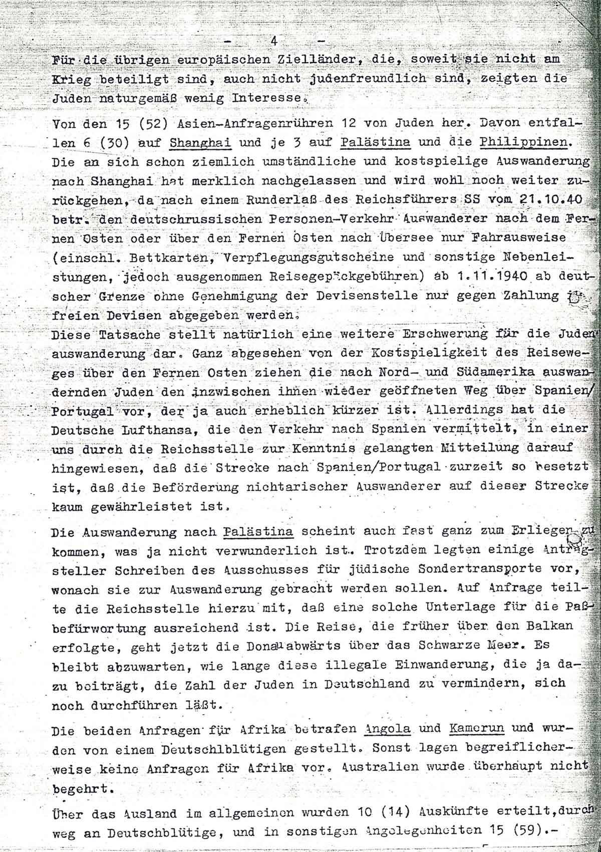 Von den 15 (52) Asien-Anfragen rühren 12 von Juden her. Davon entfallen 6 (30) auf Shanghai und je 3 auf Palästina und die Philippinen. Die an sich schon ziemlich umständliche und kostspielige Auswanderung nach Shanghai hat merklich nachgelassen und wird wohl noch weiter zurückgehen, da nach einem Runderlaß des Reichsführers SS vom 21.10.40 betr. den deutschrussischen Personen-Verkehr Auswanderer nach dem Fernen Osten oder über den Fernen Osten nach Übersee nur Fahrausweise (einschl. Bettkarten, Verpflegungsgutscheine und sonstige Nebenleistungen, jedoch ausgenommen Reisegepäckgebühren) ab 1.11.1940 ab deutscher Grenze ohne Genehmigung der Devisenstelle nur gegen Zahlung in freien Devisen abgegeben werden.
