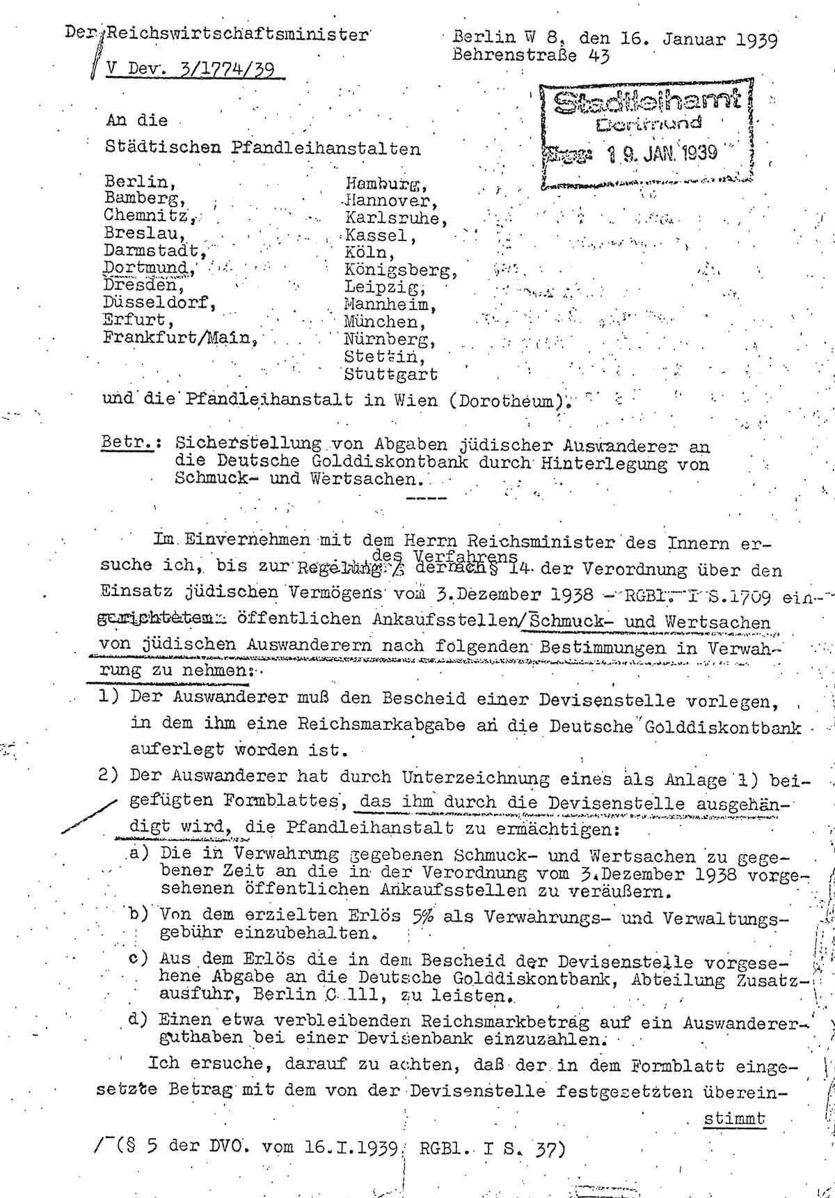 Am 16. Januar 1939 versendet der Reichswirtschaftsminister folgendes Schreiben an die städtischen Pfandleihanstalten: