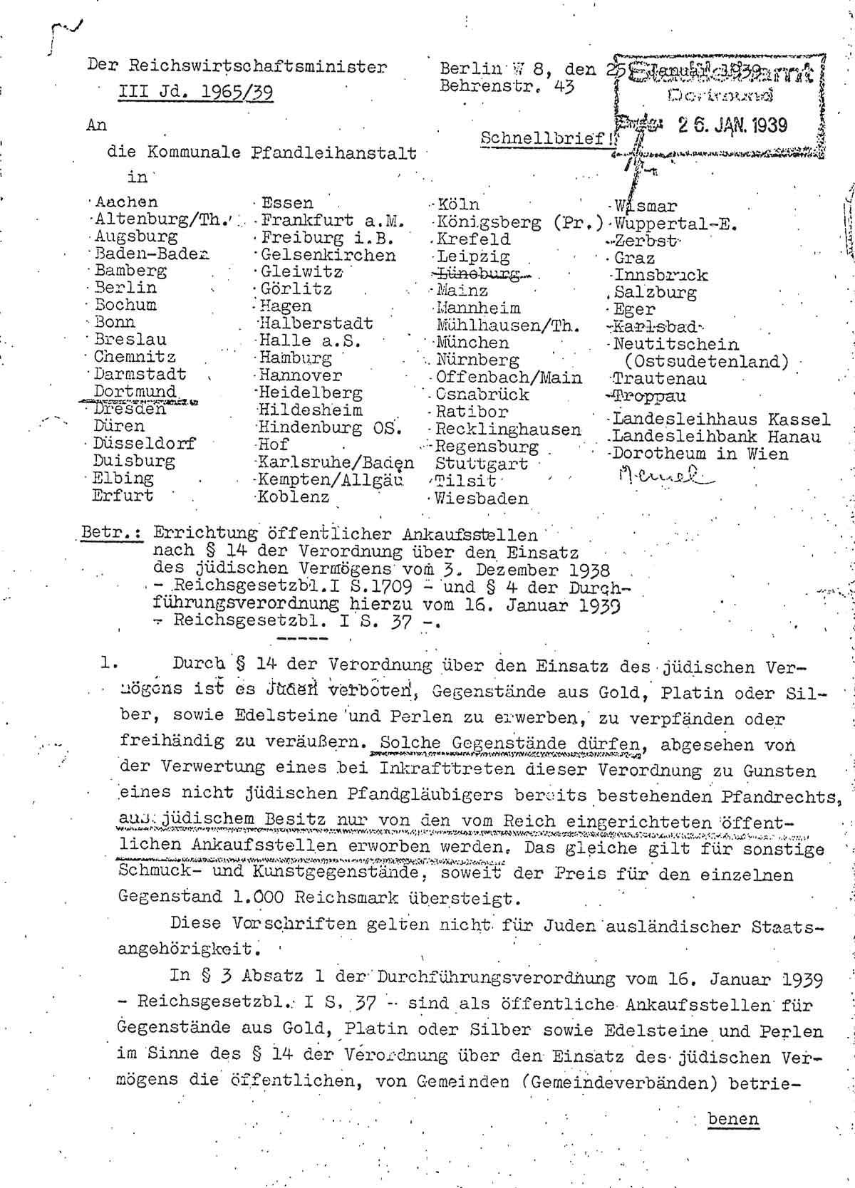 Am 25. Januar 1939 versendet der Reichswirtschaftsminister folgendes Schreiben an die städtischen Pfandleihanstalten: