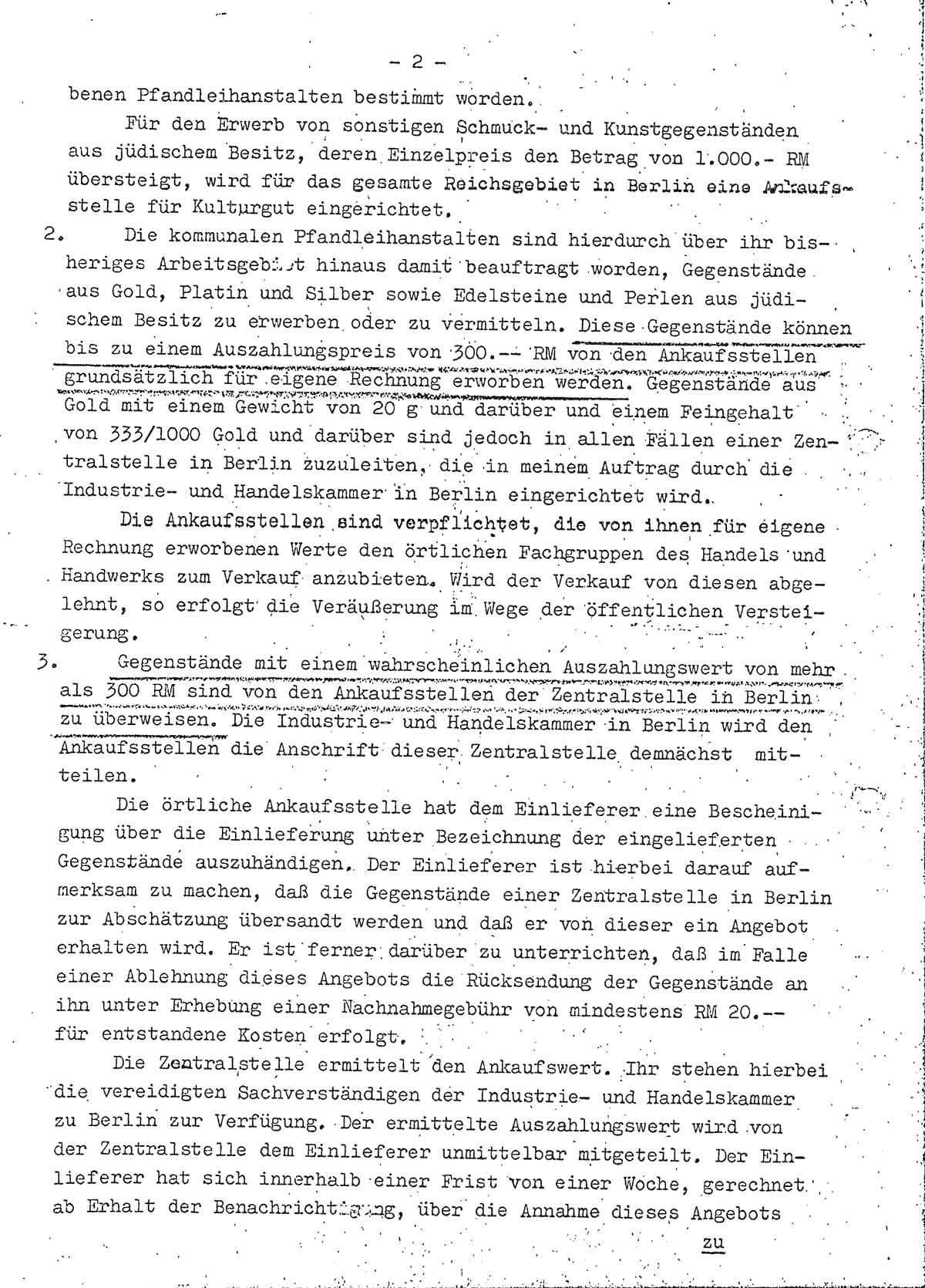 2. Die kommunalen Pfandleihanstalten sind hierdurch über ihr bisheriges Arbeitsgebiet hinaus damit beauftragt worden, Gegenstände aus Gold, Platin und Silber sowie Edelsteine und Perlen aus jüdischem Besitz zu erwerben oder zu vermitteln. Diese Gegenstände können bis zu einem Auszahlungspreis von 300.-- RM von den Ankaufsstellen grundsätzlich für eigene Rechnung erworben werden. Gegenstände aus Gold mit einem Gewicht von 20 g und darüber und einem Feingehalt von 333/1000 Gold und darüber sind jedoch in allen Fällen einer Zentralstelle in Berlin zuzuleiten, die in meinem Auftrag durch die Industrie- und Handelskammer in Berlin eingerichtet wird.