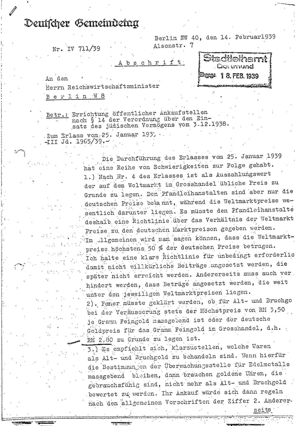 Am 14. Februar 1939 wendet sich der Deutsche Gemeindetag wegen der "Errichtung öffentlicher Ankaufsstellen für jüdische Wertsachen" an das Reichswirtschaftsministerium: