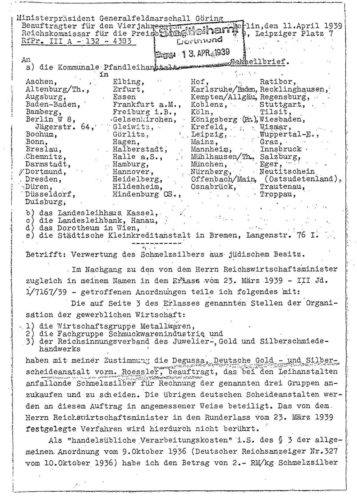 Göring als Beauftragter für den Vierjahresplan verschickt am 11. April 1939 folgendes Schreiben an die kommunalen Pfandleihanstalten u.a.:
