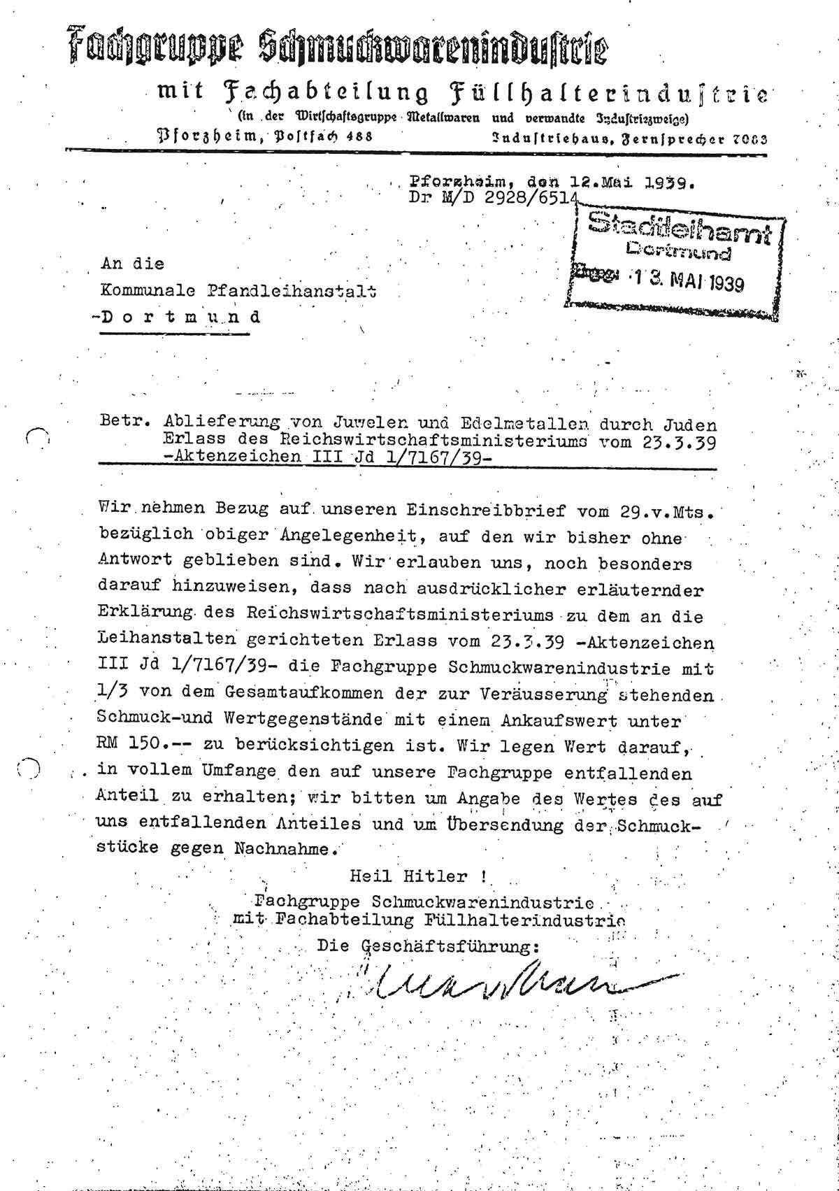 Am 12. Mai 1939 verschickt die Fachgruppe Schmuckwarenindustrie der Wirtschaftsgruppe Metallwaren in Pforzheim u.a. folgendes Schreiben an die städtische Pfandleihanstalt Dortmund: