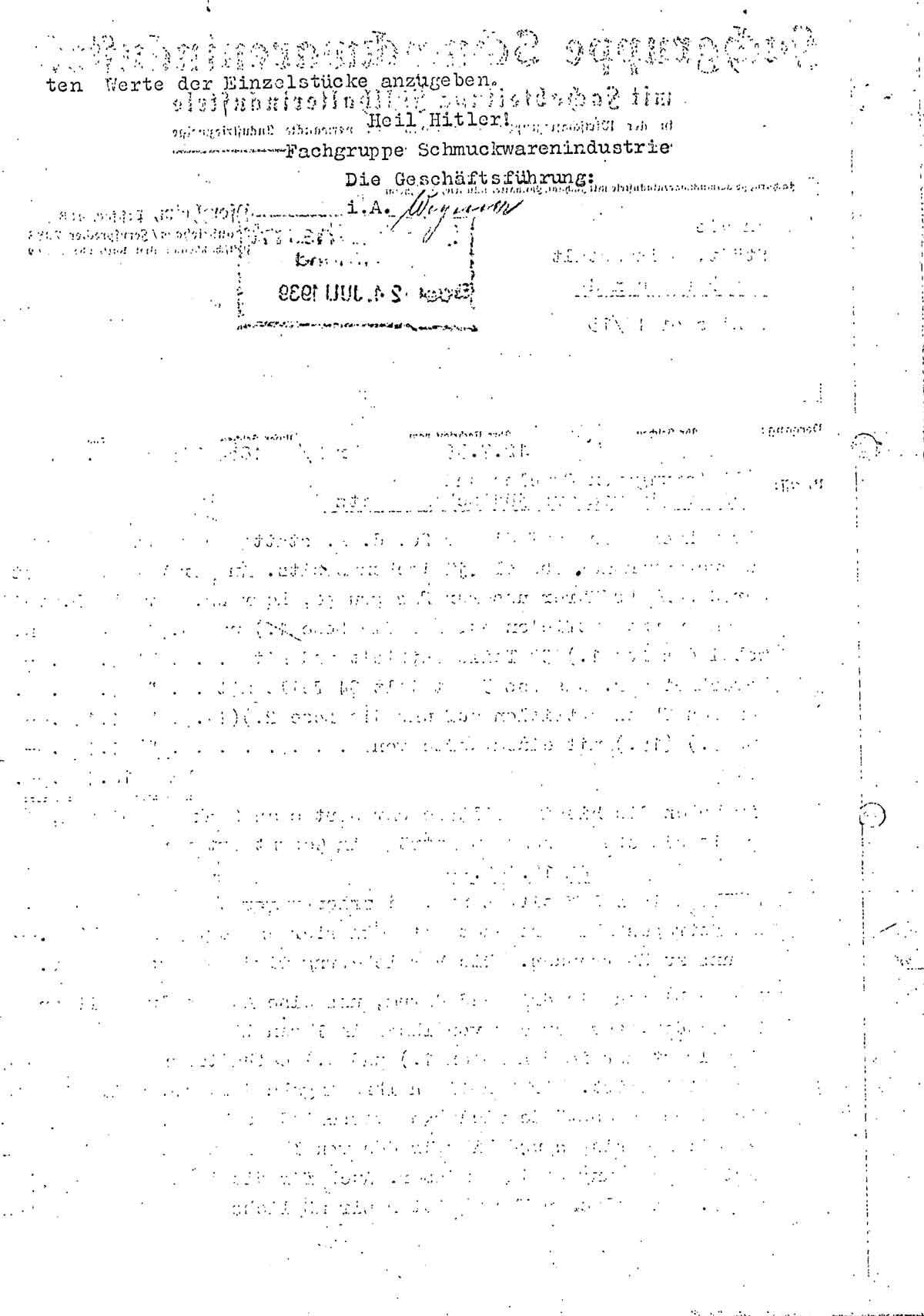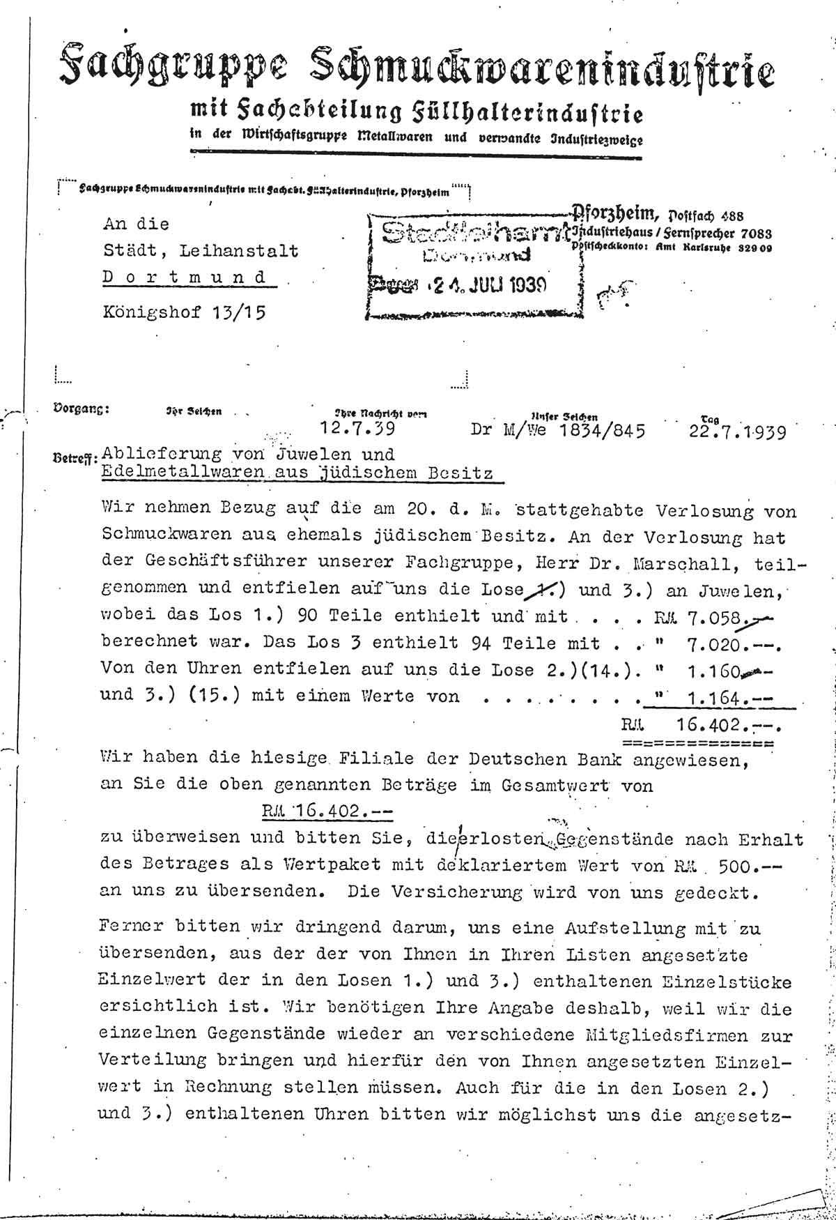 Am 22. Juli 1939 verschickt die Fachgruppe Schmuckwarenindustrie der Wirtschaftsgruppe Metallwaren u.a. folgendes Schreiben an die städtische Pfandleihanstalt Dortmund:
