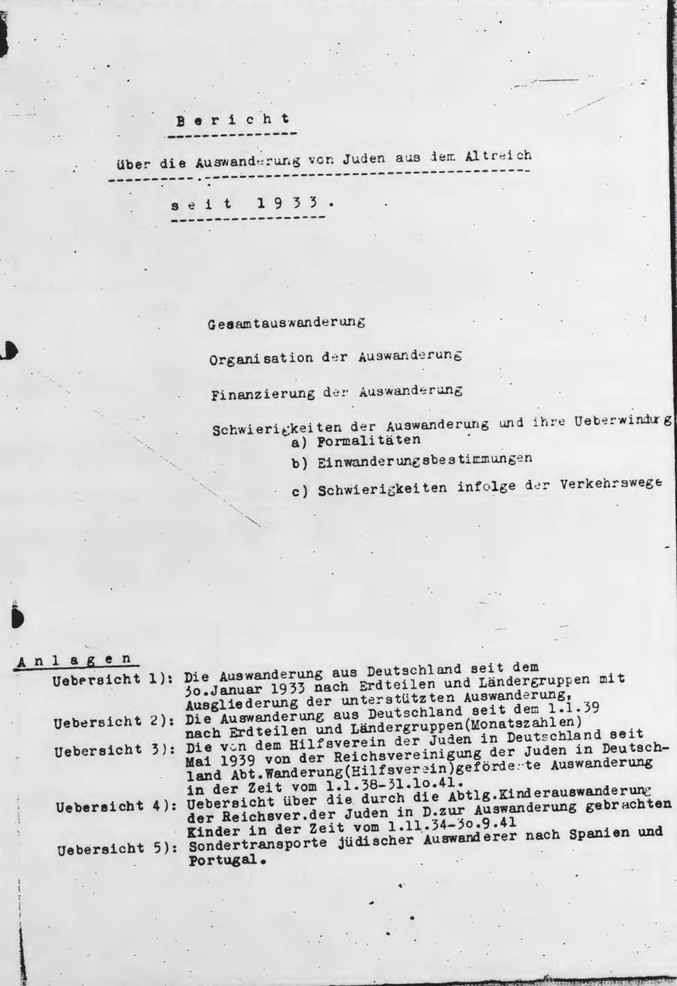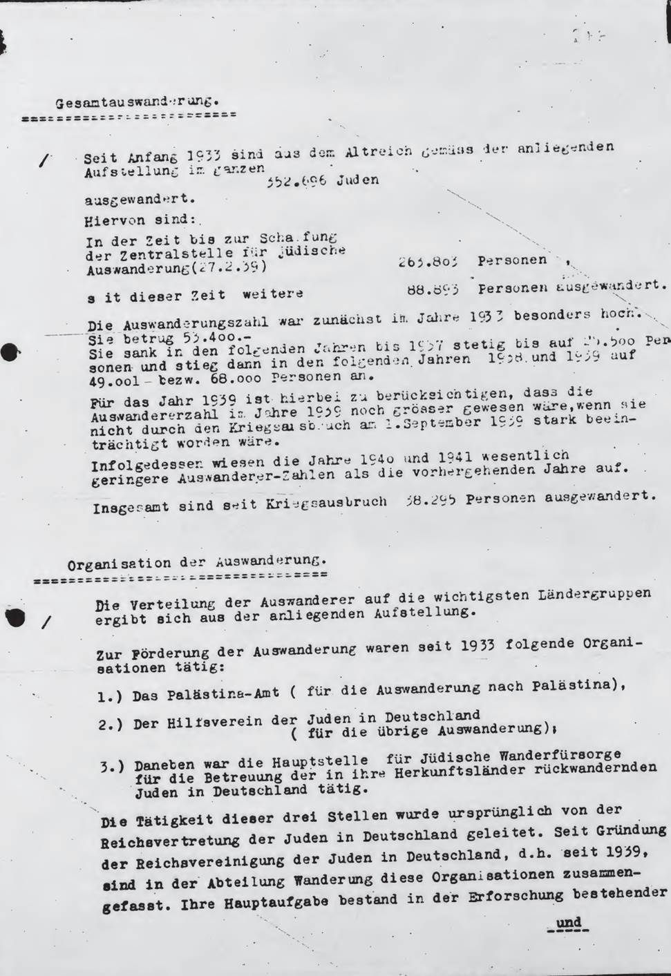 Vermutlich die Zentralstelle für jüdische Auswanderung in Berlin gibt Anfang November 1941 folgenden Bericht über die "Auswanderung von Juden aus dem Altreich seit 1933" ab: