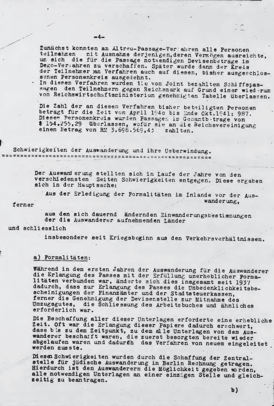 Wenn auch die Bezahlung des Passagepreises in Devisen zunächst eine erhebliche Erschwerung der Auswanderung mit sich brachte, so konnte diese Schwierigkeit durch Entgegenkommen des Joint, der die notwendigen Devisen für diese Zwecke bereitstellte, behoben werden. Diese Schwierigkeit wurde nach Ausbruch des Krieges noch dadurch grösser, dass alle Passagen in Devisen bezahlt werden mussten. Aber auch hierfür wurden vom Joint die notwendigen Mittel zur Verfügung gestellt.