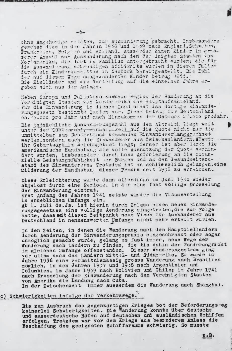 Erst Ende 1938 bezw. Anfang 1939 traten in den europäischen Ländern gewisse Erleichterungen für die Einwanderung ein, so insbesondere für die Einwanderung nach England. Allein die Zahl derjenigen Personen, deren Auswanderung finanziell durch die Abteilung Wanderung unterstützt wurde, beetrug 8.[..]0. Hierbei ist zu berücksichtigen, dass die Kosten der Auswanderung nach England so gering waren, dass sie in den meisten Fällen von den Auswanderern selbst getragen wurden. Daher ist die Zahl der im Jahre 1939 nach England eingewanderten auf ein Mehrfaches der oben angegebenen Zahl 8.[..]0 zu veranschlagen. Diese Entwicklung fand mit Ausbruch des Krieges ihr Ende.