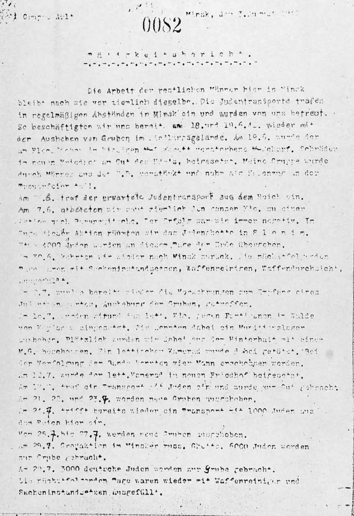 Am 26.6. traf der erwartete Judentransport aus dem Reich ein. Am 27.6. arbeiteten wir [..] ziemlich den ganzen [..]. zu einer Aktion nach [..]. Der Erfolg war wie immer negativ. Im Zuge dieser Aktion räumten wir das Judenghetto in Slonim. Etwa 1000 Juden wurden an diesem Tage der Erde übergeben.