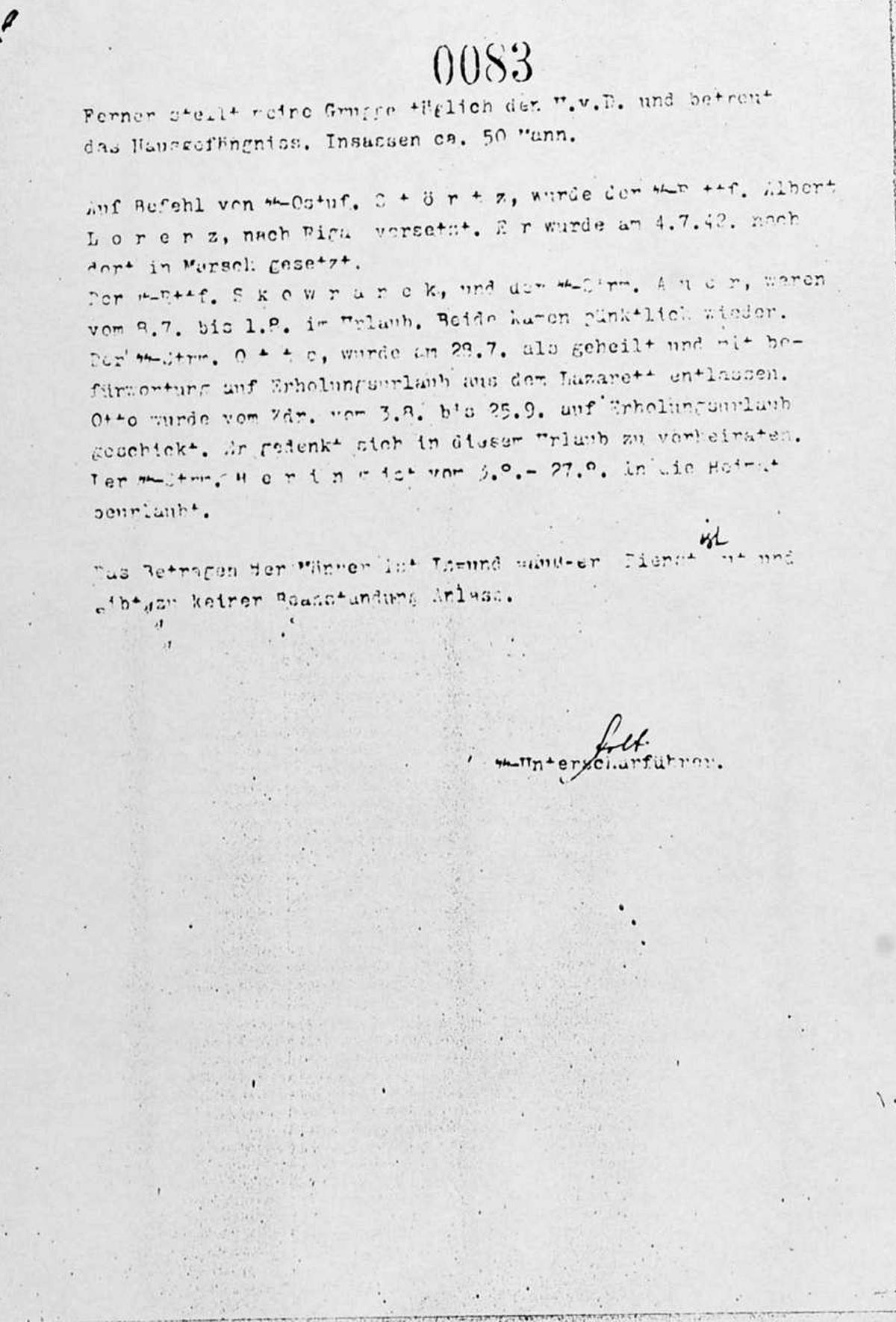 Der SS-Bttf. Skowranek, und der SS-Strm. Auer, waren vom 8.7. bis 1.8. im Urlaub. Beide kamen pünktlich wieder. Der SS-Strm. Otto, wurde am 28.7. als geheilt und mit Befürwortung auf Erholungsurlaub aus dem Lazarett entlassen. Otto wurde vom Kdr. vom 3.8. bis 25.9. auf Erholungsurlaub geschickt. Er gedenkt sich in diesem Urlaub zu verheiraten. Der SS-Strm. Hering ist vom 3.8.-27.8. in die Heimat beurlaub.