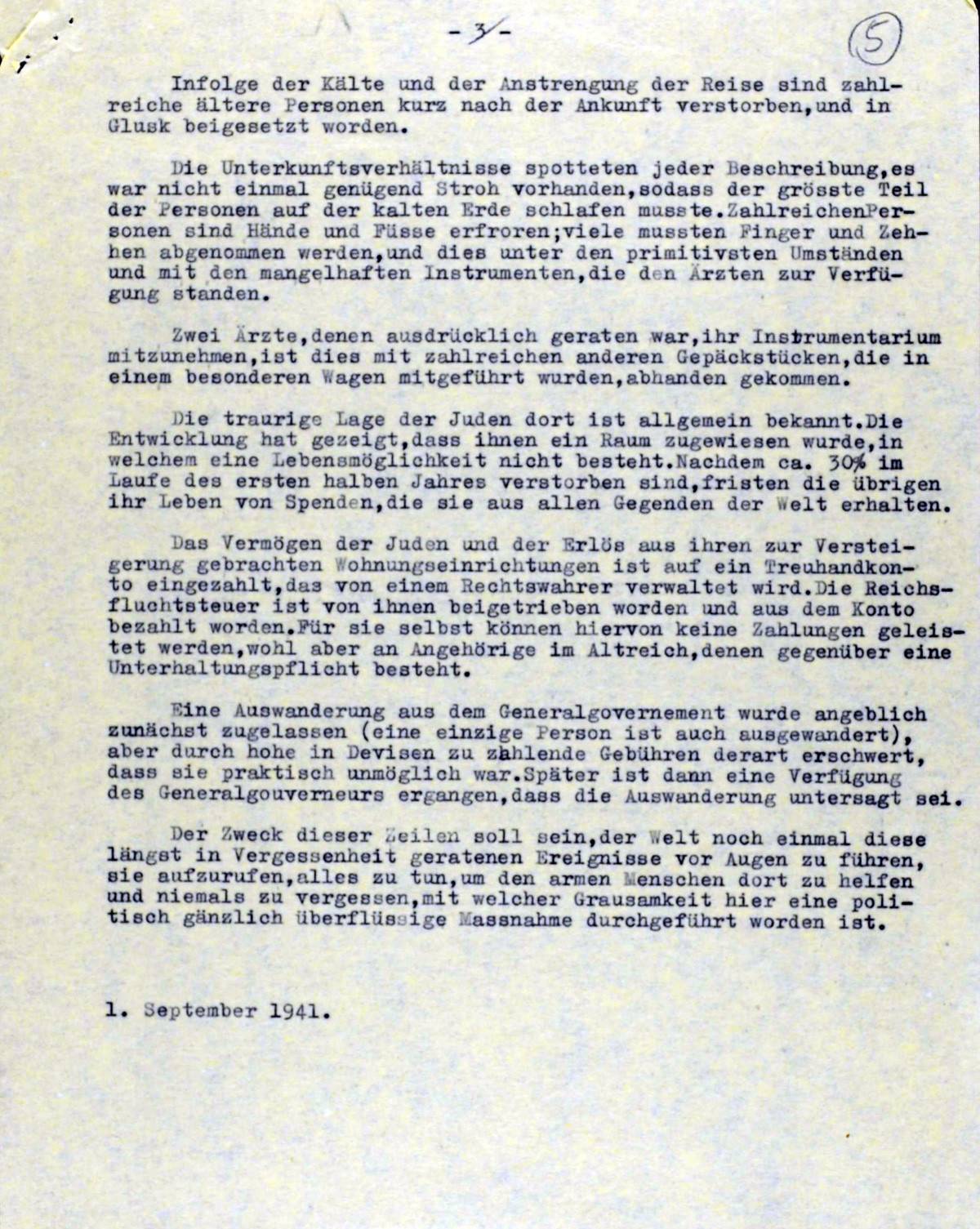 Eine Auswanderung aus dem Generalgovernement wurde angeblich zunächst zugelassen (eine einzige Person ist auch ausgewandert), aber durch hohe in Devisen zu zahlende Gebühren derart erschwert, dass sie praktisch unmöglich war. Später ist dann eine Verfügung des Generalgouverneurs ergangen, dass die Auswanderung untersagt sei.