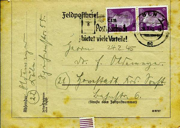 [3] Eine Durchsicht der überlieferten Quellen zeigt, dass tatsächlich ein großer Teil der ins Ausland gerichteten Briefe durch die Zensurstelle der Wehrmacht überprüft wurde, was sich durch entsprechende Etiketten auf den zensierten Briefen und Zensurstriche auf den Briefbögen belegen lässt. Tatsächliche Zensur in Form von Durchstreichungen oder Ausschnitten aus den Schreiben wurde dagegen offenbar weniger geübt. Das dürfte wohl vorwiegend auf das hohe Maß an Selbstbeschränkung auf Seiten der Absender zurückzuführen gewesen sein, um so die Zustellung der Briefe nicht zu gefährden.