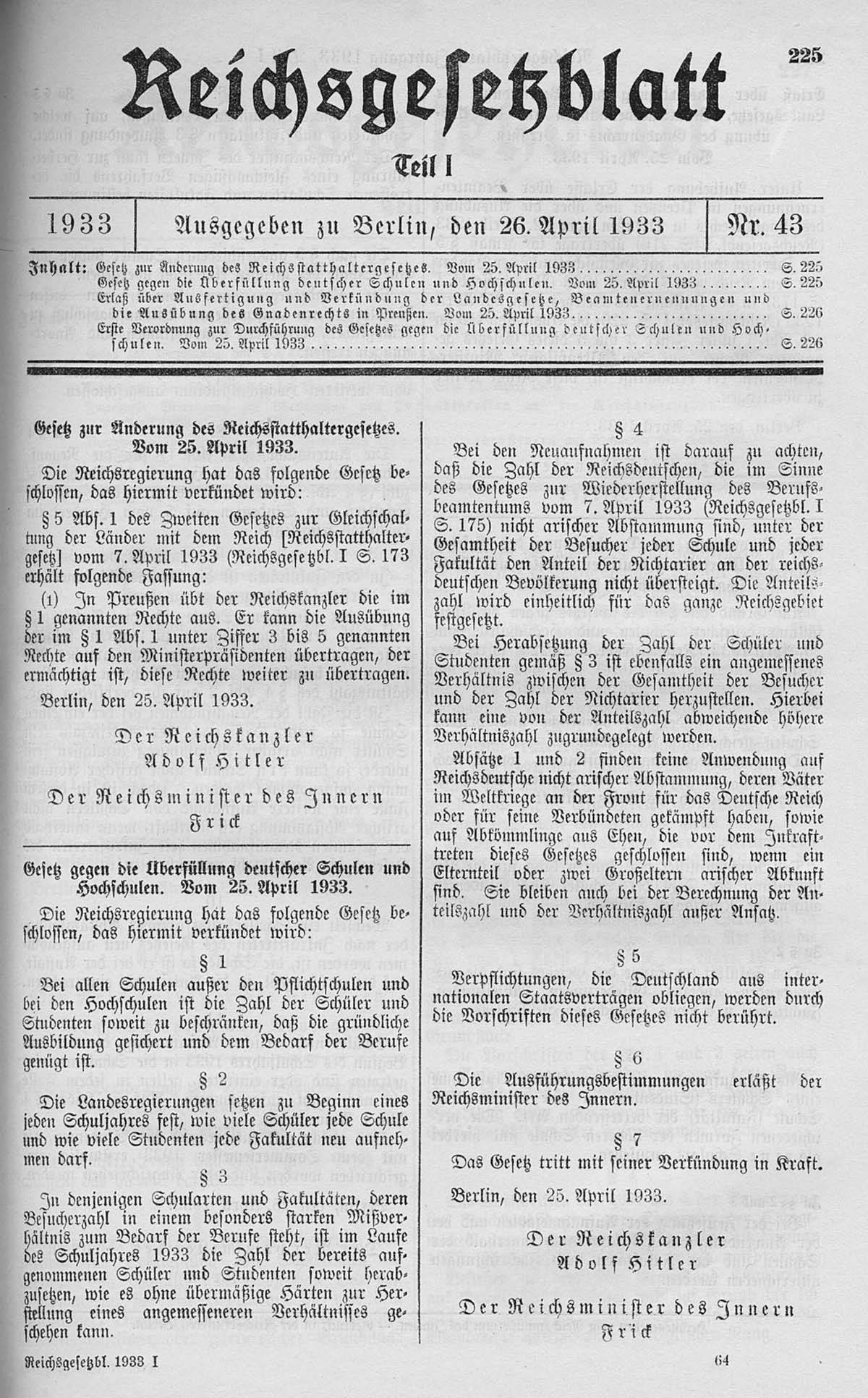 Das „Gesetz gegen die Überfüllung deutscher Schulen und Hochschulen“ vom 25. April 1933 reglementierte während der Zeit des Nationalsozialismus die Anzahl der Schüler höherer Schulen und Studenten und berücksichtigte dabei das rassistische Merkmal einer „nichtarischen“ Abstammung. Das Gesetz ist vor allem als Teil der antisemitischen Gesetzgebung im Nationalsozialismus bekannt. Neben „Nichtariern“ waren insbesondere auch Frauen von Einschränkungen betroffen.