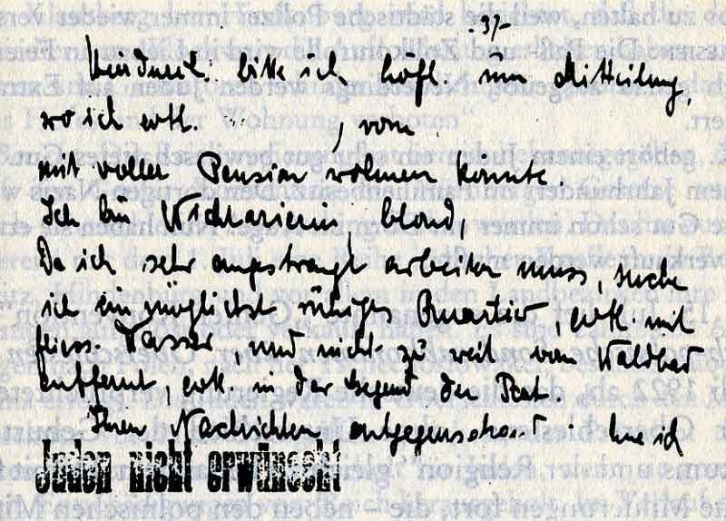 2. Bericht: Eine jüdische Dame hat an die Kurverwaltung eines kleineren Badeorts folgende Anfrage wegen eines Kuraufenthalts gerichtet und kurzerhand mit dem Stempelvermerk: „Juden nicht erwünscht“ zurückerhalten: [vgl. Abbildung]