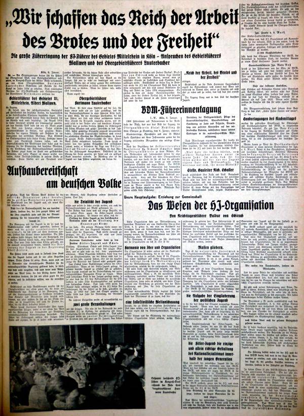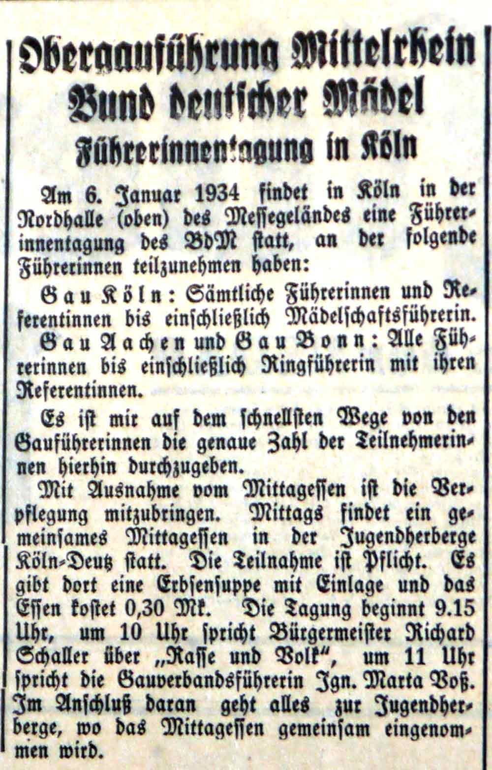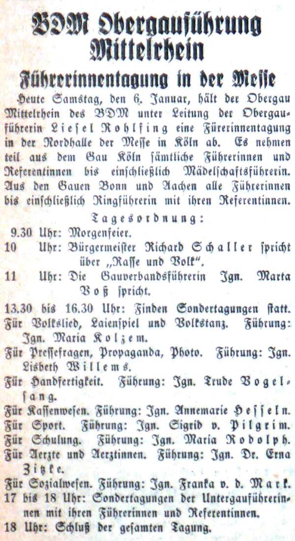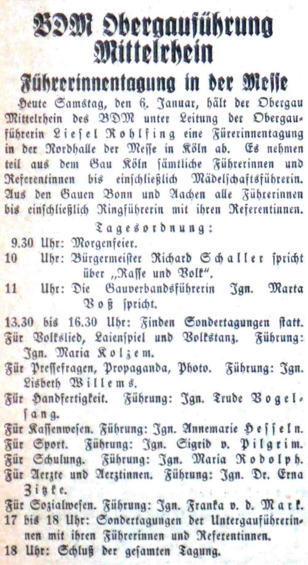 Am 6. Januar 1934 findet in der Nordhalle der Kölner Messe eine Führerinnentagung der Obergauführung Mittelrhein statt, an der 1800 Führerinnen der Gaue Köln, Aachen und Bonn teilnehmen. Zur Teilnahme verpflichtet sind vom Gau Köln sämtliche Führerinnen und Referentinnen bis einschließlich der Mädelschaftsführerinnen und von den Gauen Aachen und Bonn alle Führerinnen bis einschließlich Ringführerin mit ihren Referentinnen.
