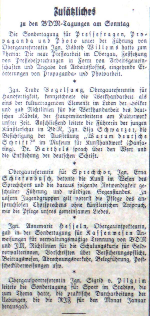 Die Obergau-Referentin für das Soziale Amt, Franka v.d. Mark, spricht danach über die Kinder-Landverschickung, und Gauverbandsführerin Voß im Anschluss über das Frauenbild im BDM, das sie mit Blick auf die Weimarer Republik vom "Zerrbild der Frau der Not- und Elendsjahre" absetzt. Dem BDM gehe es um das "ganze Mädel", unabhängig von seiner Konfession, die sie als Hindernis für die Einheit Deutschlands darstellt.