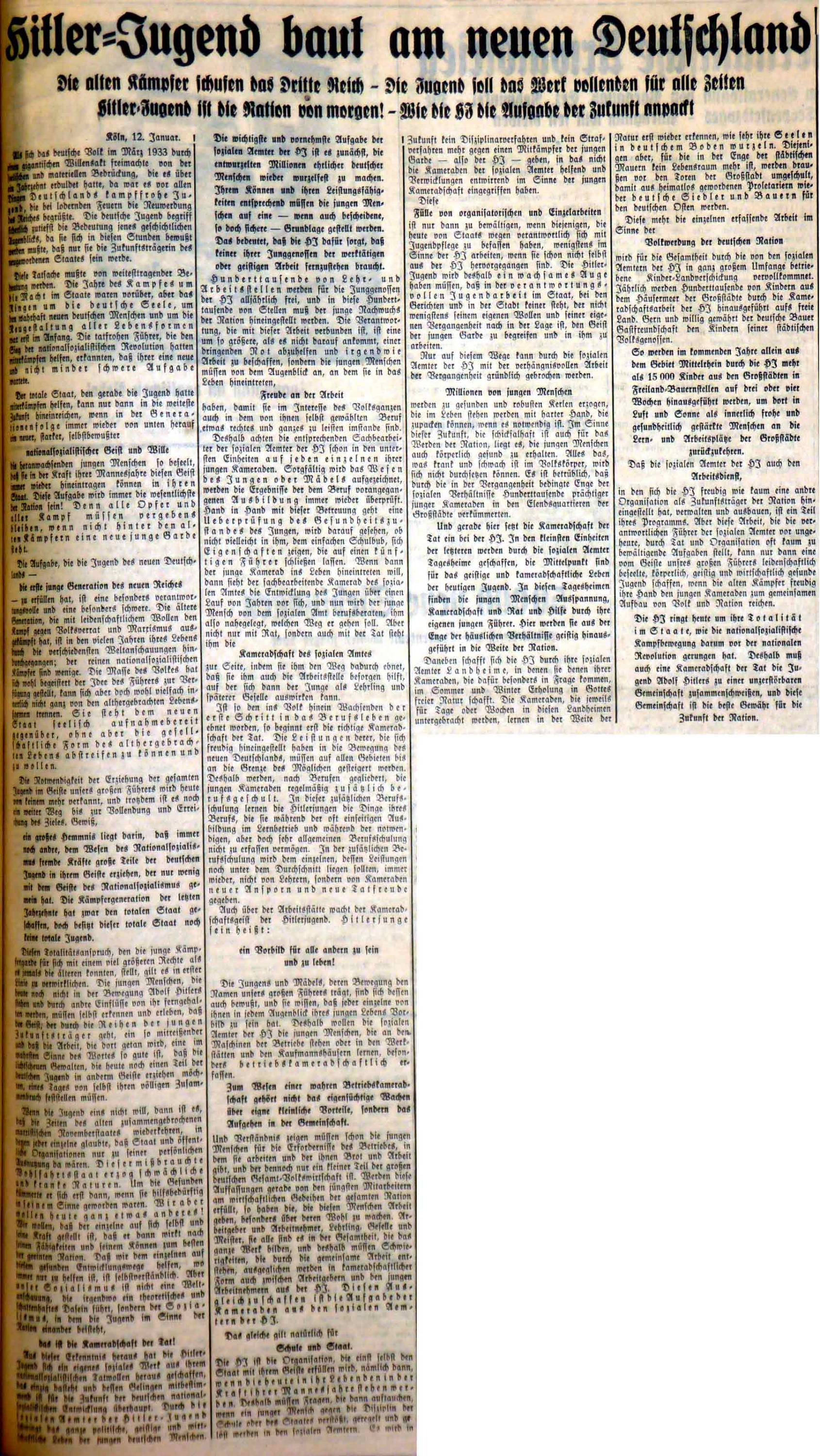 In einem großen Artikel im Westdeutschen Beobachter umreißt die HJ am 12. Januar 1934 die weitreichenden Ziele ihrer sozialen Arbeit, die im Sinne des Totalitätsanspruchs der HJ perspektivisch immer mehr Bereiche umfassen soll, die zuvor andere Stellen innegehabt haben.